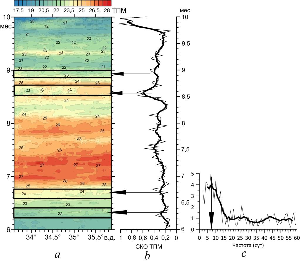 На втором этапе 123-го рейса значения ТПМ по контактным измерениям изменялись в пределах 26–27,4°С, что близко к диапазону пространственной изменчивости ТПМ на первом этапе (рис. 2, d). В отличие от первого этапа более низкие значения ТПМ (< 26,4°С) отмечались не только в западной, но и в восточной части съемки, а в центральной части полигона и в отдельных локальных областях у его южной границы ТПМ повышалась до 27°С. По спутниковым данным значения ТПМ были заметно ниже и изменялись в диапазоне 22–23,5°С (рис. 3, a). Судя по долготно-временно́му распределению ТПМ, в период выполнения второго этапа съемки температура монотонно понижалась, т. е. в конце августа уже наблюдалось охлаждение поверхностных вод (рис. 3, a). Таким образом, несинхронность контактных измерений при наличии сезонного сигнала может существенно влиять на пространственное распределение фактической ТПМ. Частично справиться с этой проблемой можно путем детрендирования исходных рядов контактных измерений, которое позволяет убрать более низкочастотную составляющую изменчивости с временны́м масштабом, превышающим период выполнения съемки. При наличии низкочастотного сигнала в рядах измеренной ТПМ должна наблюдаться значимая линейная связь между значением ТПМ на каждой станции и порядковым номером этой станции (фактически временны́м запаздыванием измерений). Оценки показали, что коэффициент корреляции R между значением ТПМ и порядковым номером станции в 122-м рейсе достигал 0,66 (рис. 4, a), в 123-м рейсе – 0,51 (рис. 4, b), т. е. в распределениях фактической ТПМ содержался значимый положительный тренд. Судя по спутниковым данным, положительный тренд в 122-м рейсе (июнь) был связан с устойчивым сезонным прогревом поверхностных вод (рис. 3, a; 4, a). Во время 123-го рейса (август) на фоне уже начавшегося общего осеннего пони-жения ТПМ наблюдались периоды прогрева и охлаждения поверхностных вод на синоптическом масштабе. Временно́е распределение среднесуточных значе-ний пространственного среднеквадратического отклонения (СКО) ТПМ по спутниковым данным вдоль изобаты 50 м (рис. 3, b) показало, что его изме-нения особенно заметны в период первого этапа съемки 123-го рейса, когда контрасты ТПМ между западной и восточной частями полигона по контакт-ным (рис. 2, c) и спутниковым (рис. 3, a) данным были наиболее выражены, что обусловило резкое повышение значений СКО. Отметим, что период вы-полнения каждого этапа съемки (6–8 сут) примерно совпадал с периодич-ностью, наблюдаемой во временно́м изменении пространственных СКО ТПМ, т. е. с периодичностью усиления синоптических возмущений ТПМ по спутниковым данным (рис. 3, b). Расчет функции спектральной плотности распределения СКО ТПМ по спутниковым данным показал, что эта перио-дичность составляет ~ 7 сут (рис. 3, c).