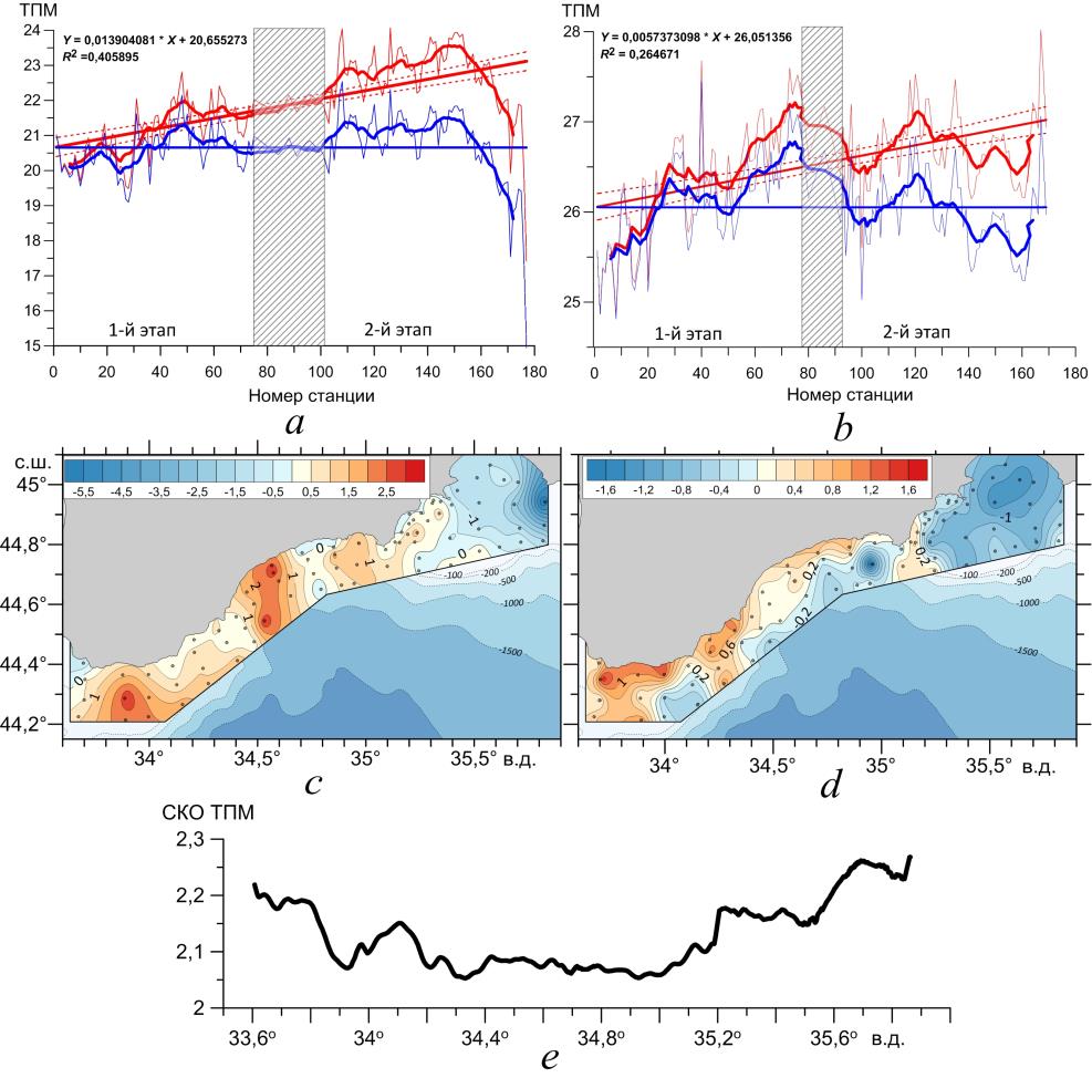 Fig. 4. SST(°С) distribution depending on the station serial number (red curves are the actual temperature, blue ones – the detrended temperature; thick curves are smoothing by a moving average over 11 stations, dashed ones – the boundaries of the 95% confidence interval of statistical significance; the interval between the stations performed during of the first and second stages is shaded) based on the data of the 122nd (a) and 123rd (b) cruises; difference between the detrended SST values obtained in the repeated surveys of the 122nd (c) and 123rd (d) cruises; change of the SST standard deviation with a longitude along the 50 m isobath (e) based on satellite data
