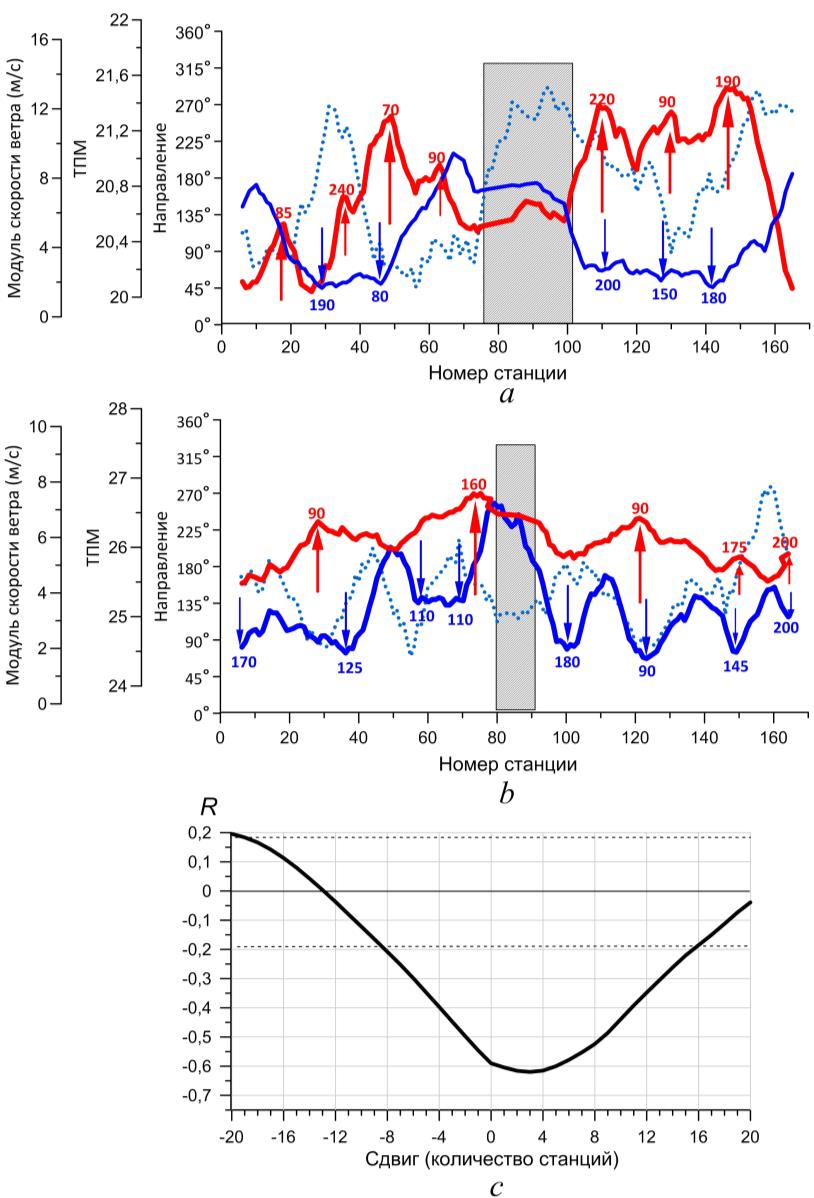 Рис. 5. Распределение детрендированных значений ТПМ (°С) (красные кривые), модуля (синие сплошные кривые) и направления (синие пунктирные кривые) скорости ветра по данным 122-го (a) и 123-го (b) рейсов НИС «Профессор Водяницкий» (промежуток между выполнением станций в ходе первого и второго этапов заштрихован; красными стрелками показаны максимумы ТПМ, синими – минимумы скорости ветра; числа у стрелок – направление ветра в градусах); график взаимно-корреляционной функции ТПМ и модуля скорости ветра по данным 122-го рейса (штриховые линии – границы доверительного интервала 95%-ного уровня статистической достоверности) (c)