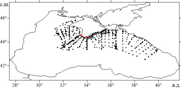 Район исследования и отбор проб. Данные получены в 2013–2021 гг. в ходе выполнения экспедиционных исследований ФГБУН ФИЦ МГИ, которые проводились на НИС «Профессор Водяницкий» и Maria M. Merian (ноябрь 2013 г.). Отбор гидрохимических проб на глубоководных станциях проводили на изопикнических поверхностях σt, равных 16,30; 16,20; 16,10; 16,00; 15,95; 15,90; 15,80; 15,60; 15,40; 15,20; 15,00; 14,60 кг/м3, кассетой из 12 батометров СTD-прибора Seabird-Electronics. Схема расположения гидрохимических станций, на которых отбирались пробы на содержание кислорода, сероводорода, биогенных элементов, компонентов карбонатной системы, приведена на рис. 1. На 8 станциях отбор проб на определение содержания сероводорода, кислорода и ионов аммония проводился тремя зондированиями на 37 горизонтах: в двух зондированиях пробы отбирались по глубине от максимального погружения на 2000 м, далее через 50 м до глубины 1800 м и затем через 100 м. В третьем зондировании пробы отбирали по ряду изопикн, приведенному выше, и с поверхности.