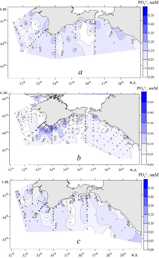 Рис. 5. Пространственная изменчивость концентрации фосфатов в поверхностном слое вод Черного моря в весенний (а), летний (b) и осенний (с) периоды