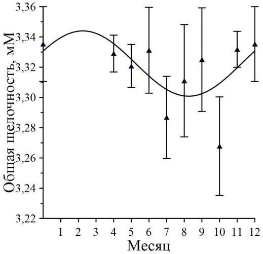 Для средних значений общей щелочности поверхностных вод северной части Черного моря сезонная изменчивость характеризуется синусоидальным ходом с минимальными значениями (3,268–3,283 мМ) в летне-осенний период (июль – начало октября) и с максимальными предположительно в зимне-весенний (рис. 8). При этом разница между минимальными и максимальными средними значениями составляет 66 мкМ, что более чем в 10 раз превышает погрешность метода измерений 5.