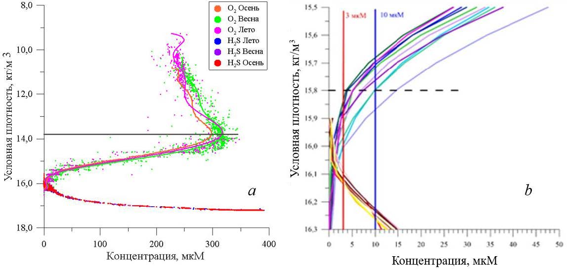 Рис. 9. Концентрация кислорода и сероводорода по всей водной толще (а) и в диапазоне st = 15,5–16,3 кг/м3 (b) в различные сезоны