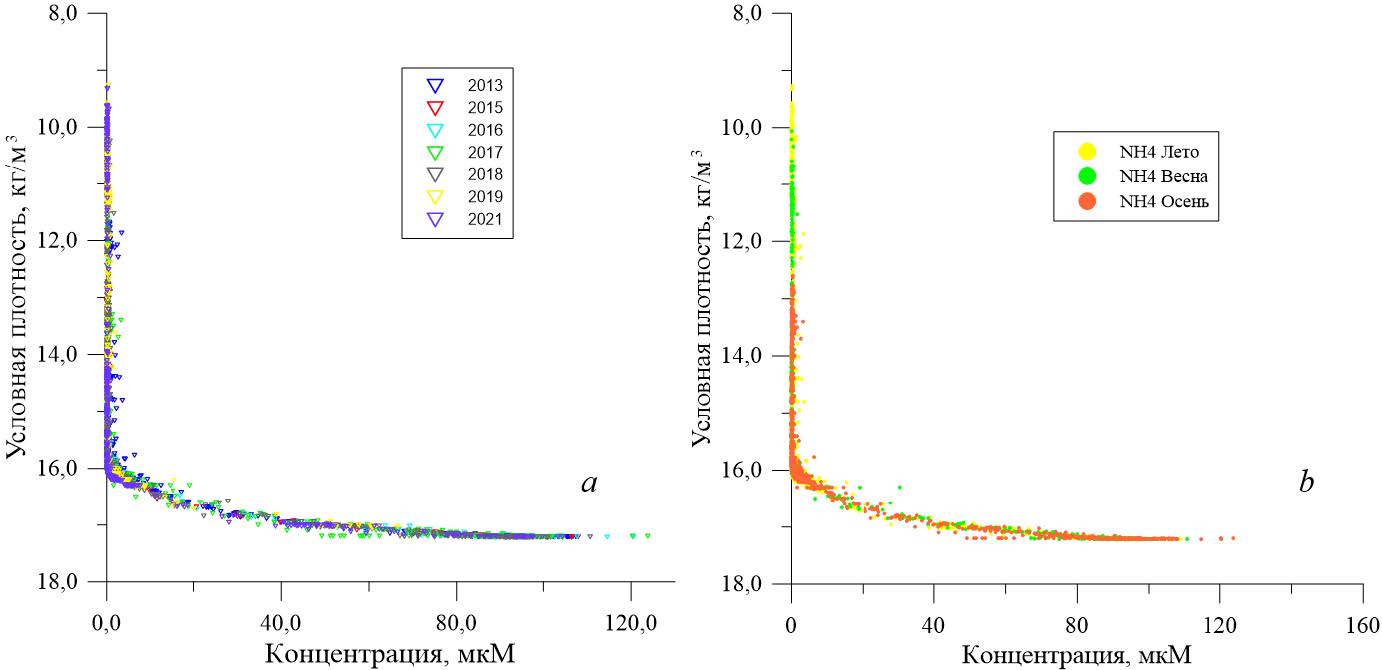 Рис. 12. Вертикальное распределение аммонийного азота в шкале условной плотности в 2013–2021 гг. (а) и по сезонам (b)
