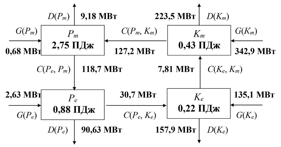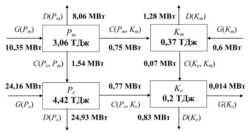 Генерационные и диссипативные составляющие бюджета Pm и Pe превалируют. Дополнительные оценки слагаемых G(Pm) и G(Pe) без учета влияния проливов показали, что в этом случае происходит существенная (примерно на два порядка) недооценка величины притока энергии. Таким образом, основной вклад в генерацию ДПЭ вносят потоки через проливы Босфор и Дарданеллы. Поступающая средняя ДПЭ частично расходуется на работу силы плавучести (7 %), а частично переходит в вихревую ДПЭ вследствие бароклинной неустойчивости (15 %), остальная часть диссипирует. Поток С(Ре, Рm) является наибольшим по абсолютной величине среди скоростей преобразования энергии на рис. 2. Анализ показывает, что в бюджете вихревой ДПЭ на фоне взаимной компенсации G(Pe) и D(Pe) около 50 % потока С(Ре, Рm) преобразуется в вихревую КЭ.