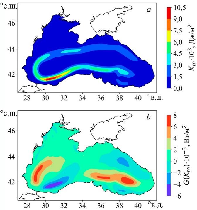 Скорость изменения вихревой КЭ, характеризующей мезомасштабную изменчивость, для обоих бассейнов определяется бароклинной неустойчивостью. При этом приток энергии в вихри вследствие баротропной неустойчивости на порядок меньше как в Черном, так и в Мраморном море. Отметим, что в результате действия процессов бароклинной неустойчивости в Черном море около четверти ДПЭ трансформируется в вихревую КЭ, а в Мраморном – примерно половина.