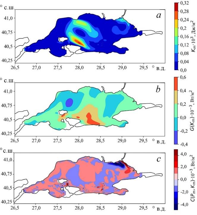 Как видно, повышенные значения Km севернее 40,75° с. ш. (рис. 5, а) соответствуют зоне положительных значений C(Pm, Km) (рис. 5, с). В области максимума Km к северо-востоку от п-ова Капыдагы (центральная часть южного побережья) наблюдаются повышенные значения G(Km) (рис. 5, b), которые при этом по абсолютной величине примерно на порядок меньше вклада работы силы плавучести. Рис. 2 и 5 свидетельствуют, что климатическая циркуляция в верхнем слое Мраморного моря в большей степени носит градиентный характер. Интенсивная трансформация ДПЭ не только в районе проливов, но и в центральной части моря, по-видимому, связана с перепадом высоты уровня [29], а также со значительной разницей в солености вод [20, 21] между Черным и Средиземным морями.