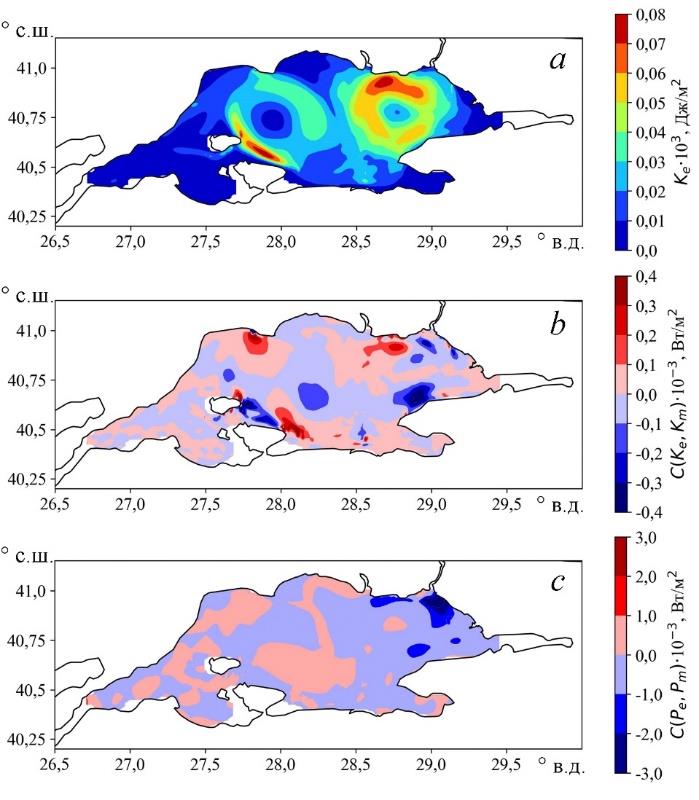 Вихревая КЭ, характеризующая мезомасштабную изменчивость, пополняется вследствие преобразования энергии в результате баротропной и бароклинной неустойчивости. При этом в Мраморном море, так же как и в Черном, трансформация энергии из доступной потенциальной в вихревую кинетическую на порядок превышает приток энергии от среднего течения. На рис. 6 представлены карты проинтегрированных по вертикали Ke, C(Ke, Km) и C(Pe, Pm). На рис. 6, а четко выражены два максимума Ке: к юго-западу от Босфора и к северо-востоку от п-ова Капыдагы.