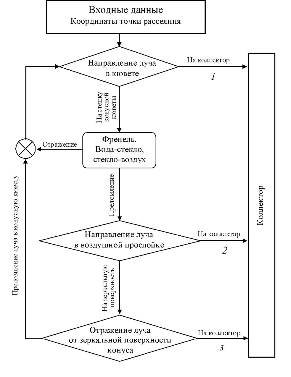 Во избежание многократного дублирования лучей малой интенсивности считалось, что свет, зеркально отраженный в направлении кварцевой конусной кюветы, проникает в среду с коэффициентом пропускания, равным единице. Относительная ошибка данного упрощения оценивается в 5%. Дальнейший расчет коэффициентов Френеля для таких лучей проводился по упрощенной схеме, а именно: из отраженного и преломленного луча выбирался луч большей интенсивности. Соответствующий коэффициент Френеля приравнивался к единице. Для заданного угла рассеяния проводилось интегрирование по двум пространственным координатам и азимуту. Потери света в данной схеме могут быть связаны только с отражением луча в направлении источника света и с поглощением света при зеркальном отражении от внешнего конусного зеркального отражателя.