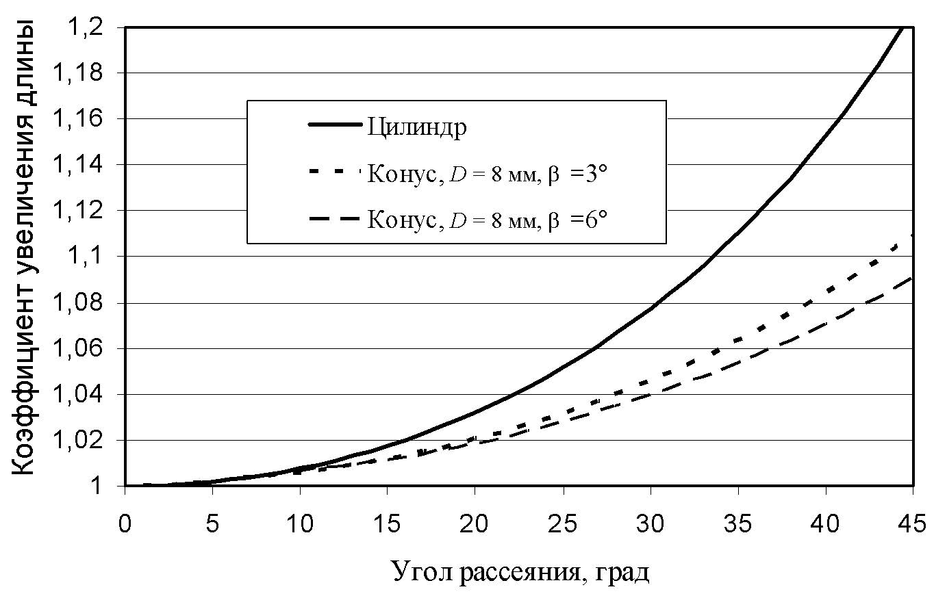 F i g. 5. Coefficient of a path length increase depending on the scattering angle for the cuvettes in the form of a cylinder and the cones with the angles 6 and 12°