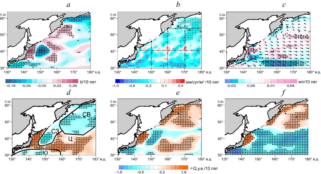 Выявленные связи характеризуют воздействие межгодовых изменений режима увлажнения на поверхности океана, адвекции и вертикального перемешивания, а соответствующие коэффициенты регрессии статистически значимы на большей части исследуемой акватории. Эти связи сложны и неоднозначны, а их характер в верхнем (рис. 4, a – c) и промежуточном (рис. 4, d, e) слоях существенно меняется с глубиной. Индекс NPGO отражает изменение интенсивности крупномасштабного северотихоокеанского циклонического круговорота, управляется изменчивостью положения и выраженности центров действия атмосферы и поля приземного ветра, связанного с колебанием давления на уровне моря в северной части Тихого океана, и оказывает удаленное и запаздывающее воздействие на систему течений Куросио-Ойясио и термические условия прилегающих районов окраинных морей западной части Тихого океана с некоторой фазовой задержкой [27].