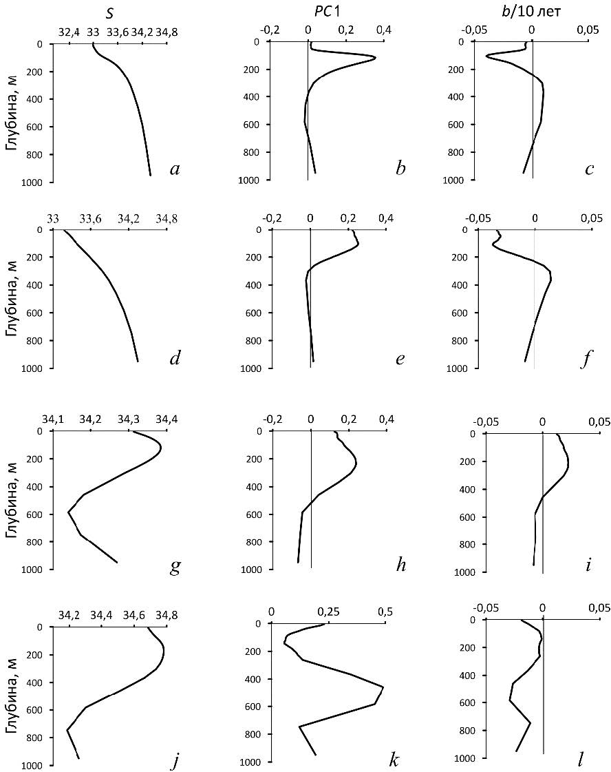 Р и с. 2. Обобщенные кривые вертикального распределения солености (a, d, g, j), главного компонента PC1 ЭОФ аномалий солености (b, e, h, k) и тренда b солености на различных горизонтах (c, f, i, l) за 2000–2022 гг. Сверху вниз: районы СВ, СЗ, Ц, Ю согласно рис. 1, d