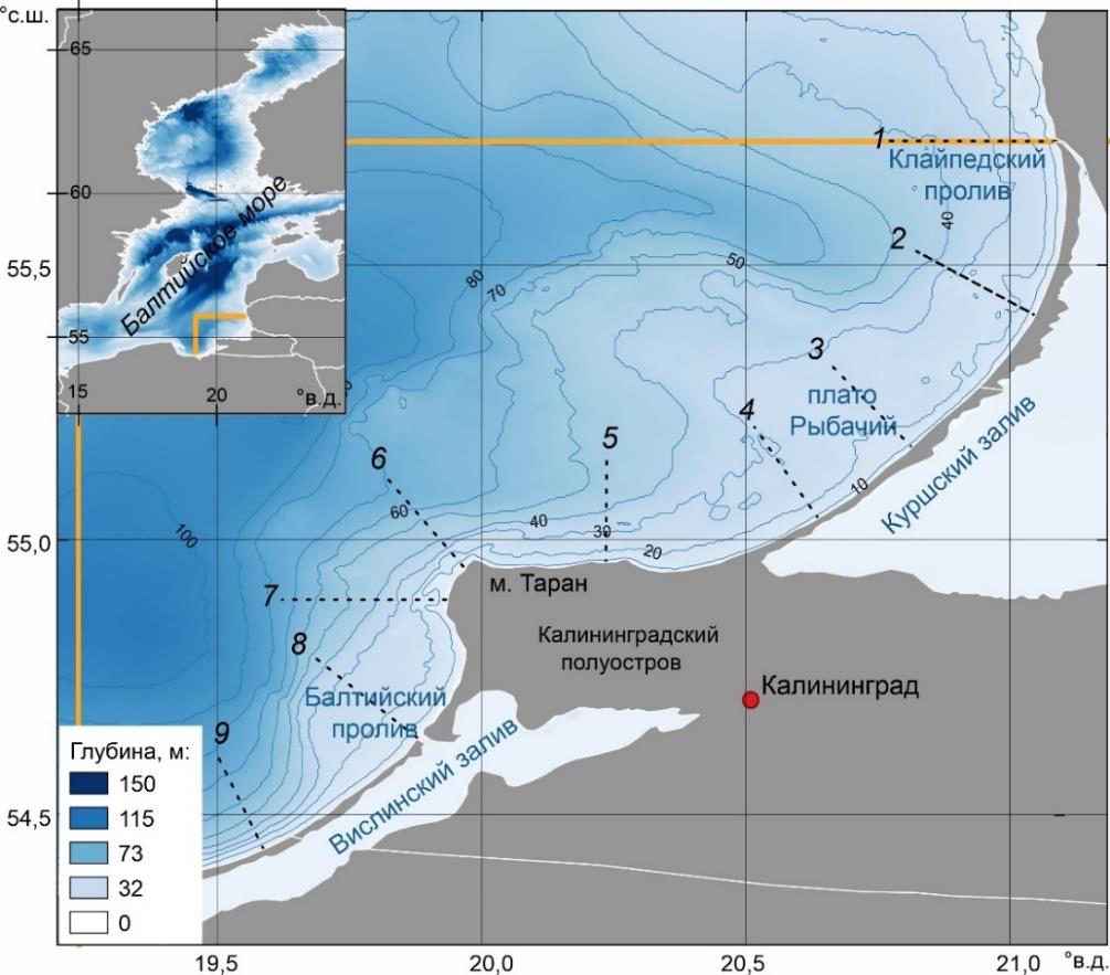 Влияние апвеллингов на концентрацию хлорофилла а в Юго-Восточной Балтике. Для каждого выделенного подъема глубинных вод с использованием программного обеспечения Quantum GIS были построены профили изменчивости хлорофилла а длиной ~ 20 км, что примерно соответствовало прибрежным изобатам от 0 до 30–75 м. Всего вдоль побережья построены 9 профилей, расположенных по нормали к берегу с интервалом (в зависимости от конфигурации берега) 7–30 км между ними (рис. 1). Выбор положения профилей был проведен с учетом районов с наибольшей повторяемостью апвеллингов из [2, 26]. Значения хлорофилла а на профилях были получены из ежедневых карт данных мультисенсорных спутниковых наблюдений. Для каждого события апвеллинга отбирался для анализа один из профилей, наиболее обеспеченный данными по хлорофиллу а в течение рассматриваемого периода, путем наложения на единую географическую основу обоих исследуемых параметров.