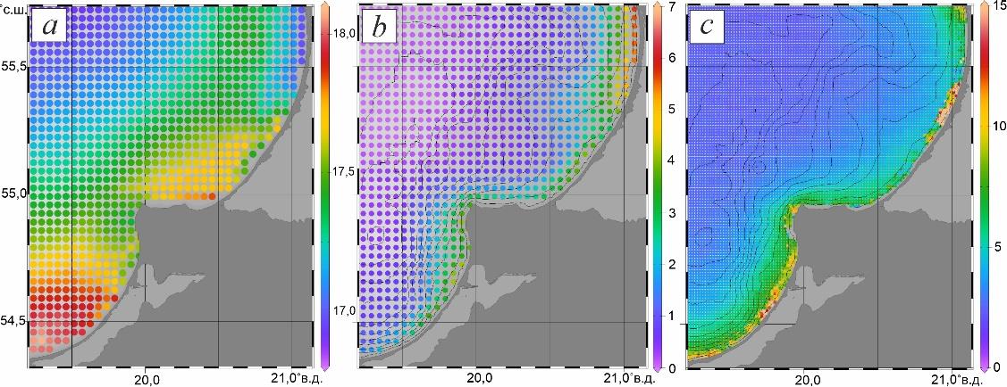 В прибрежной зоне в июне ТПМ изменялась в пределах от 13,5°C в открытой части моря до 15,5°C в районе западной части Вислинской косы; вдоль северного побережья области температура составляла ~ 15°C. К северу от плато Рыбачий наблюдалось локальное повышение температуры (до 15,3°C), в северной части Куршской косы температура составляла ~ 14,1°C, что соответствовало максимальной повторяемости отрицательных аномалий температуры в этой части прибрежной зоны (рис. 3, а). Наибольшей площади в июне апвеллинг достигал в районе плато Рыбачий, что связано с особенностями топографии дна – в этой части акватории наблюдается обширное мелководное плато. Средняя площадь апвеллинга в июне у западного побережья Калининградского п-ова была значительно меньше площади у северного, что связано с большим уклоном дна (рис. 3, b). В июне самые высокие концентрации хлорофилла а отмечались севернее плато Рыбачий. Около Вислинской косы концентрации были выше, чем вдоль северного побережья Калининградского п-ова и южной части Куршской косы, что, вероятно, связано с более высокой ТПМ в этом районе (рис. 3, c).