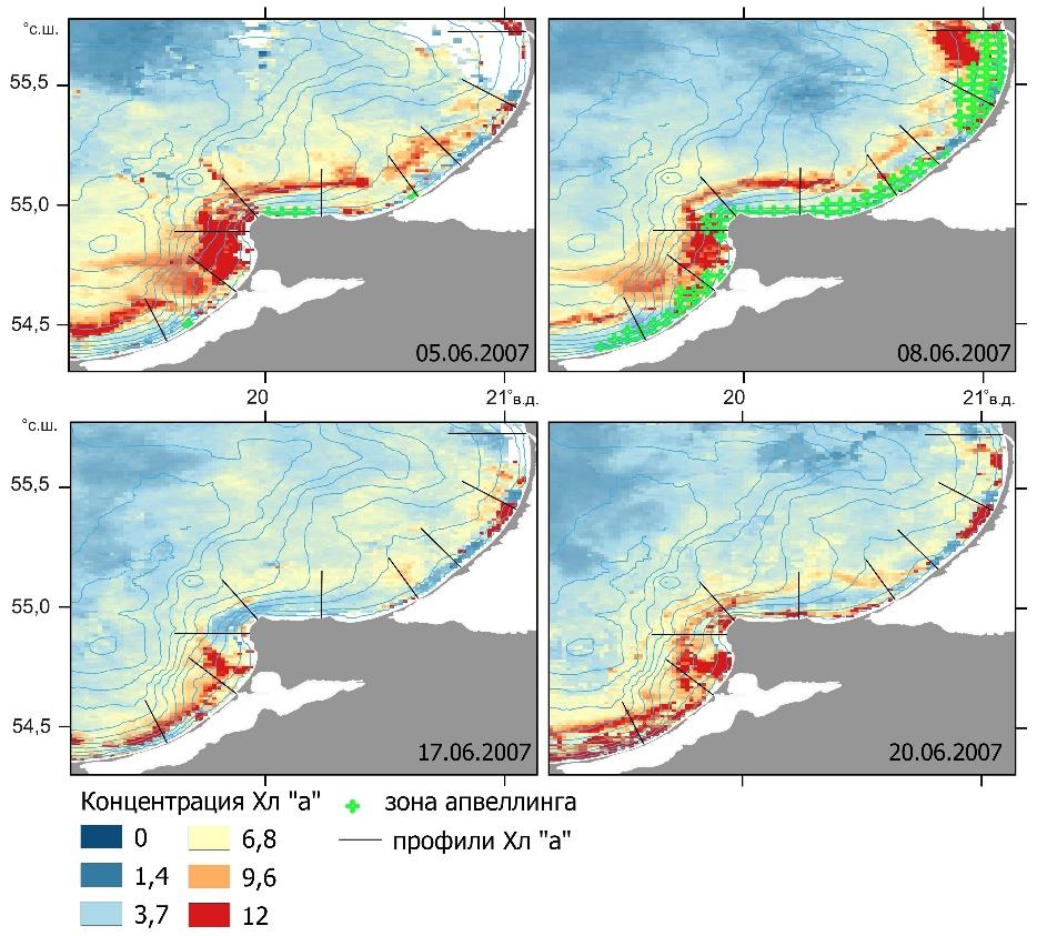 В качестве иллюстрации влияния апвеллинга на концентрацию хлорофилла а в прибрежной зоне на рис. 4 приведены карты ее изменения в июне 2007 г.