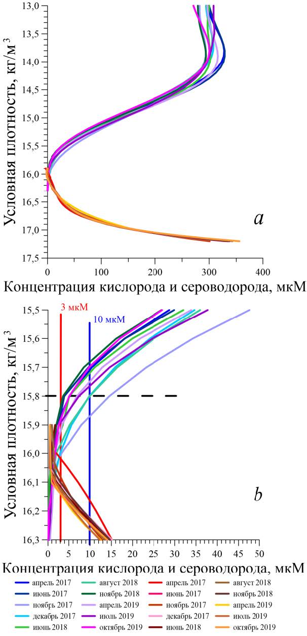 Практическое слияние вертикальных профилей кислорода (рис. 3, а) при более подробном анализе (рис. 3, b) показывает, что расположение верхней границы субкислородной зоны, определяемой по концентрации кислорода 10 мкМ, меняется во времени, от 15,7 кг/м3 до 15,9 кг/м3 (что в шкале глубин соответствует интервалу 40 м), причем выявить какую-то зависимость положения верхней границы от сезона не удалось, что неудивительно, поскольку время обновления характеристик в этом слое вод существенно превышает сезон [17, 18]. Последнее косвенно подтверждается тем, что из трех случаев, когда верхняя граница субкислородной зоны располагалась ниже t = = 15,8 кг/м3, два случая пришлись на зимние месяцы (ноябрь и декабрь 2017 г.), но подобное заглубление наблюдалось и в августе 2018 г.