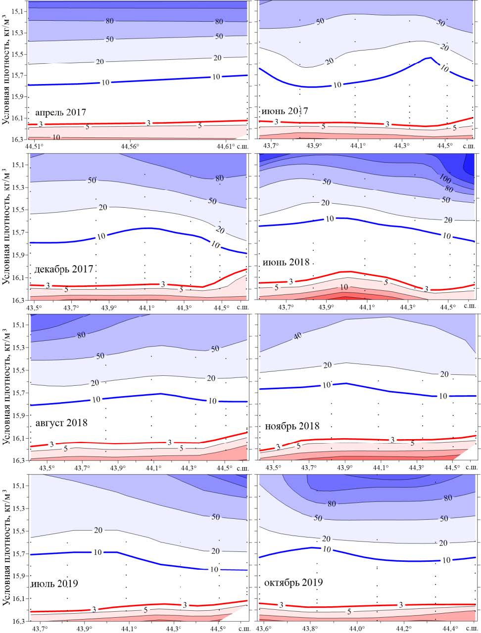 На этом фоне относительной стабильности, когда верхняя граница указанной зоны не опускалась глубже t = 15,8 кг/м3, а нижняя располагалась в небольшом интервале возле изопикны t = 16,1 кг/м3, выделяется съемка в декабре 2017 г. В данном случае на двух ближайших к шельфу станциях наблюдалось явное сужение субкислородной зоны как за счет опускания изооксигены 10 мкМ с t = 15,7–15,8 кг/м3 до t = 15,9 кг/м3, так и за счет поднятия изосульфиды 3 мкМ с t = 16,15 кг/м3 до t = 16,05 кг/м3. Таким образом, в шкале плотности толщина субкислородной зоны составила ~ 0,15 ед. t.