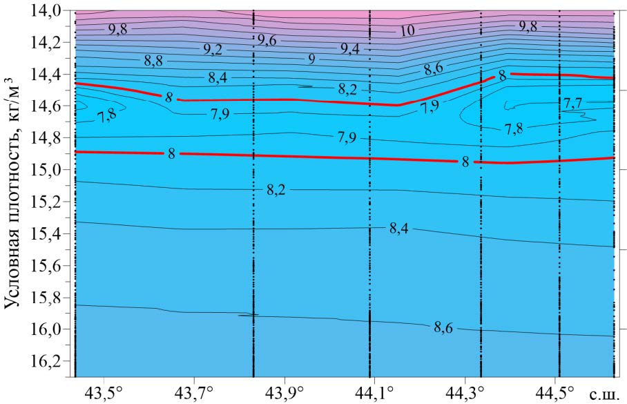 Опускание изооксигены 10 мкМ можно объяснить тем, что источником кислорода для субкислородной зоны может быть только ХПС, а при рассмотрении вертикального распределения температуры на керченском разрезе в декабре 2017 г. (рис. 7) становится ясно, что в районе 44,4º–44,6º с. ш. ХПС, определяемый по температуре 8ºС, был как толще, так и холоднее, чем окружающие воды. Отсюда и поступило дополнительное количество кислорода, которого хватило не только для окисления ВОВ, но и для опускания изооксигены 10 мкМ до t = 15,9 кг/м3.
