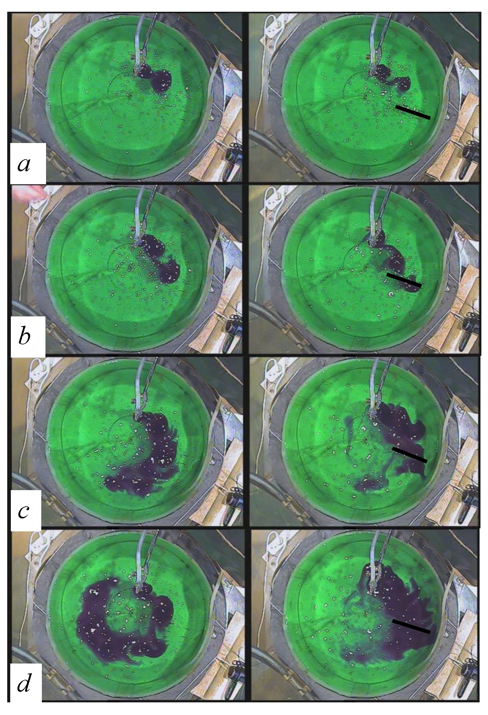 F i g. 3. Experiment 2, 3 with a smooth cone (left) and a ridge on the cone surface (right) (top view) at relation ????⁄T equal to 12 (a); 18 (b); 42 (c) and 66 (d). Salinity of water in the tank ????=1 ‰