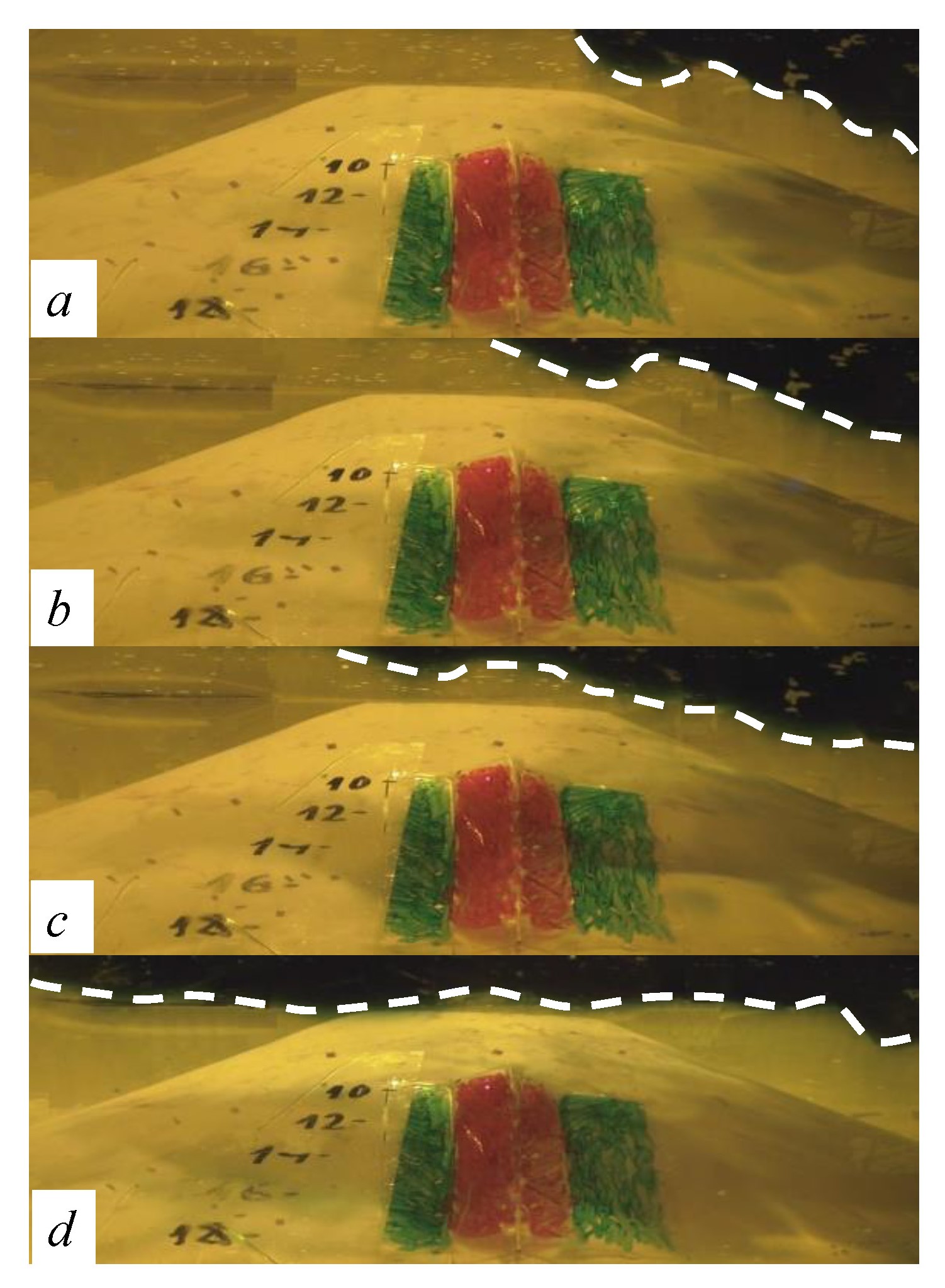 F i g. 5. Baroclinic eddy current (side view) colored blue and moving from right to left over the cone with a ridge (colored red) at t/T equal to 52 (a), 54 (b), 66 (c) and 90 (d). Salinity of water in the tank S = 1 ‰. White dotted line shows the boundary between the upper layer of fresh water and the lower layer of salt water 3