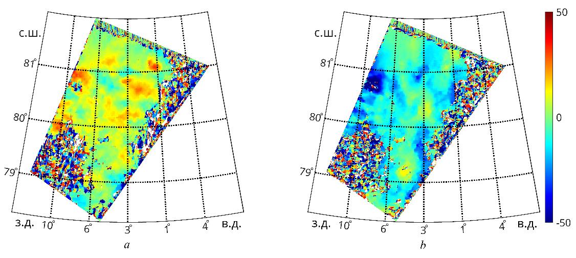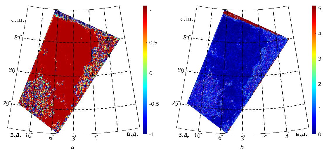 Всего было отобрано 63 пары изображений, полученных в сентябре 2017 г., а также в июле и сентябре 2018 г. Для каждой пары РЛИ временной диапазон между последовательными измерениями составил от 48 до 52 мин. Радиолокационные изображения выбирались исходя из соображений информативности, определяемой выраженностью поверхностных структур в поле дрейфующего льда. Данные интерполировались на регулярную сетку с разрешением 40 × 40 м, после чего выделялись пересечения сканируемых областей на каждом РЛИ. Дополнительно изображения сглаживались при помощи медианного фильтра со скользящим окном размером 20 × 20 пикселей. На рис. 1 показана пара РЛИ Sentinel-1A/B за 26 июля 2018 г., полученных таким образом.