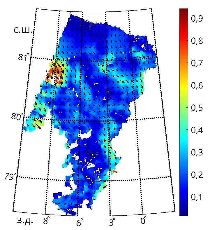 Результат всего процесса обработки данных показан на рис. 4. Видно, что диапазон наблюдаемых значений скорости дрейфа льда составляет 0,1–0,8 м/с, среднее значение скорости ~ 0,2–0,3 м/с, доминирующее направление дрейфа льда – южное, юго-восточное. Максимальные значения скорости дрейфа наблюдаются в северо-западном секторе, а также на юго-восточной периферии показанной области.
