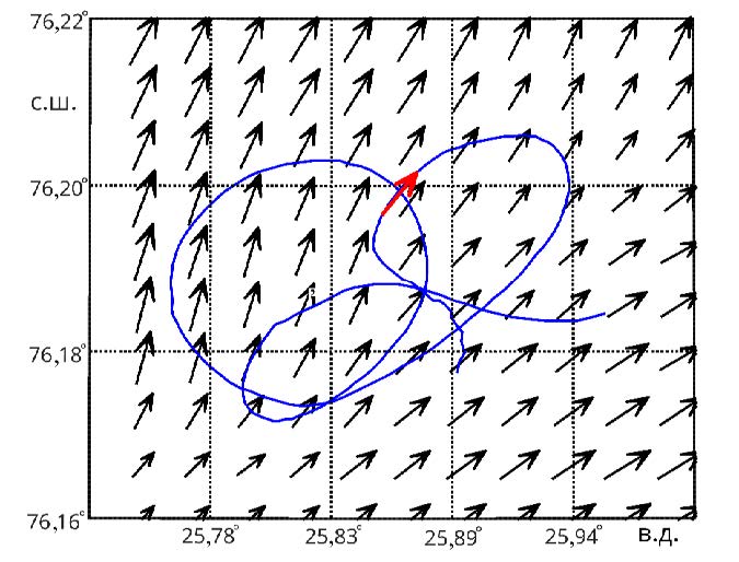 Объективная оценка эффективности описанного метода является затруднительной в силу отсутствия эталонных данных о поверхностной морской динамике. Наиболее перспективным подходом здесь представляется сопоставление восстановленных по спутниковым данным полей скорости с натурными данными о направлении и скорости дрейфа льда, полученными на основе установленных на льдинах стационарных геолокационных датчиков (GPS-треке-ров). На рис. 5 показана траектория дрейфа такого датчика на фоне рассчитанного по спутниковым данным поля скорости.