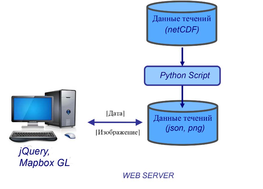 На следующем этапе продукты с восстановленными по квазисихронным спутниковым данным полями скорости дрейфа морского льда размещаются на веб-странице лаборатории морских полярных исследований (ЛМПИ) Морского гидрофизического института РАН по адресу http://polar-space.ru/arctic_currents. Для этого рассчитанные поля сначала интерполируются на сетку с шагом 40 м и записываются в виде netCDF-файлов. Для размещения в сети Интернет была разработана система визуализации данных на базе клиент-серверной архитектуры. На рис. 6 показана общая структура системы визуализации данного спутникового продукта.