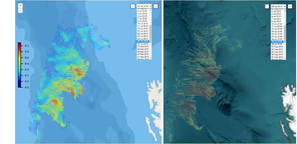 Р и с. 7. Пользовательский интерфейс системы визуализации продуктов с полями дрейфа льда в прикромочной ледовой зоне пролива Фрама за 26 июля 2018 г. Слева – пример статического отображения полей дрейфа льда, справа – динамическое поле с использованием библиотеки Wind-JS