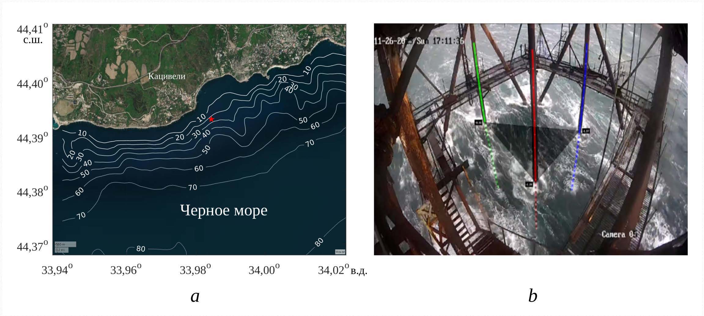 На рис. 1, b показан кадр видеозаписи, выполненной 26 ноября в автоматическом режиме во время шторма в 14:00–14:20. Три вертикальных элемента конструкции, выделенные на рисунке цветом, были использованы как решетка «оптических волнографов». Наблюдаемый в кадре уровень воды на соответствующих вертикальных линиях пересчитывался в вертикальные смещения морской поверхности в трех точках с использованием известного точного положения видеокамеры и ее оптических параметров. Треугольник на рисунке показывает виртуальную плоскость, соединяющую эти точки, которая дает уклоны крупномасштабных волн в двух ортогональных направлениях. Таким образом, эти данные оказываются аналогичными данным стандартного волнового буя 2, а их обработка методом триплет-анализа [28] позволяет оценить частотно-угловой спектр волнения для промежутка времени видеозаписи (более детальное описание метода оценки приведено в [29, 30]).