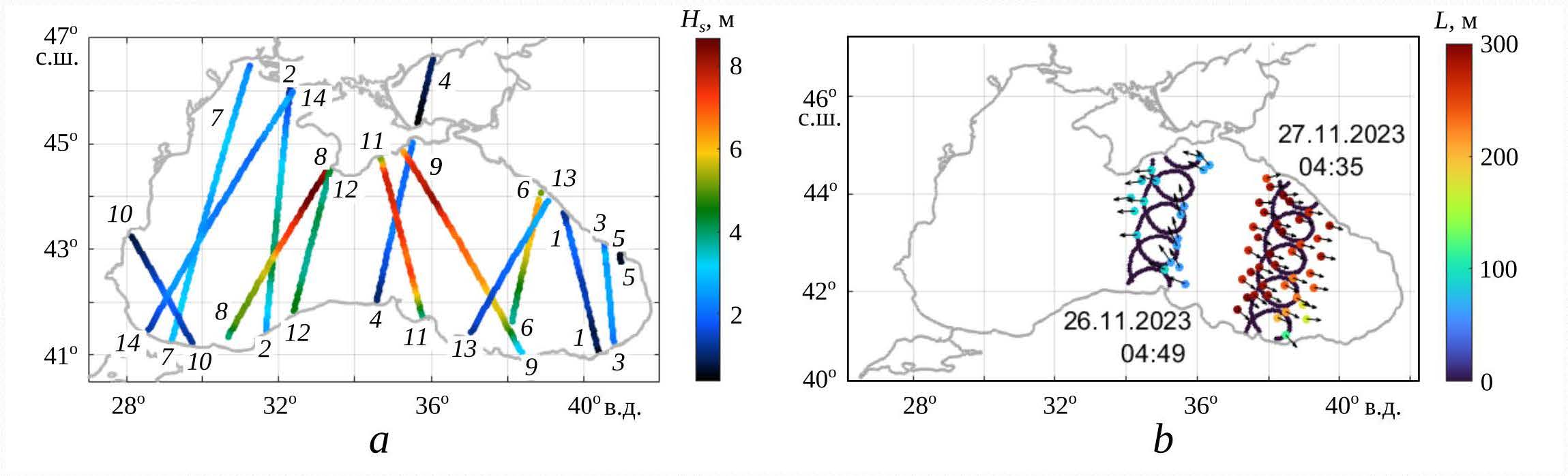 F i g. 2. Measurement data: a – satellite altimeter tracks indicating the wave heights ; b – tracks ofthe SWIM sensor (CFOSAT) with the indicated wave directions (arrows) and lengths L (color)
