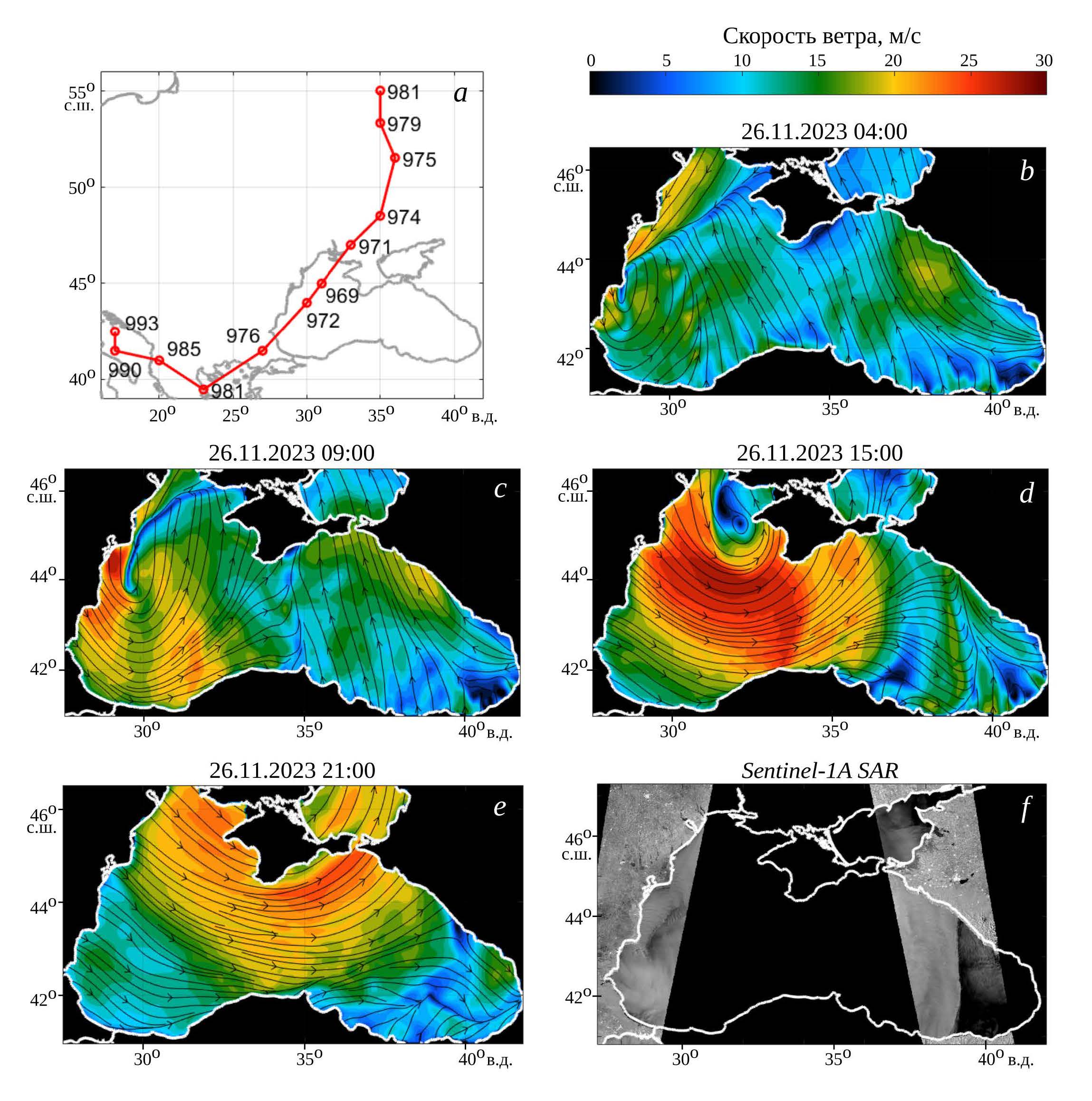 Р и с. 3. Характеристики атмосферы: трек урагана и давление на уровне моря в его центре (a); линии тока и скорость ветра 26 ноября в 04:00 (b), 09:00 (c), 15:00 (d), 21:00 (e). Спутниковые радиолокационные изображения, полученные 26 ноября в 04:14 (слева) и 15:20 (справа) (f)