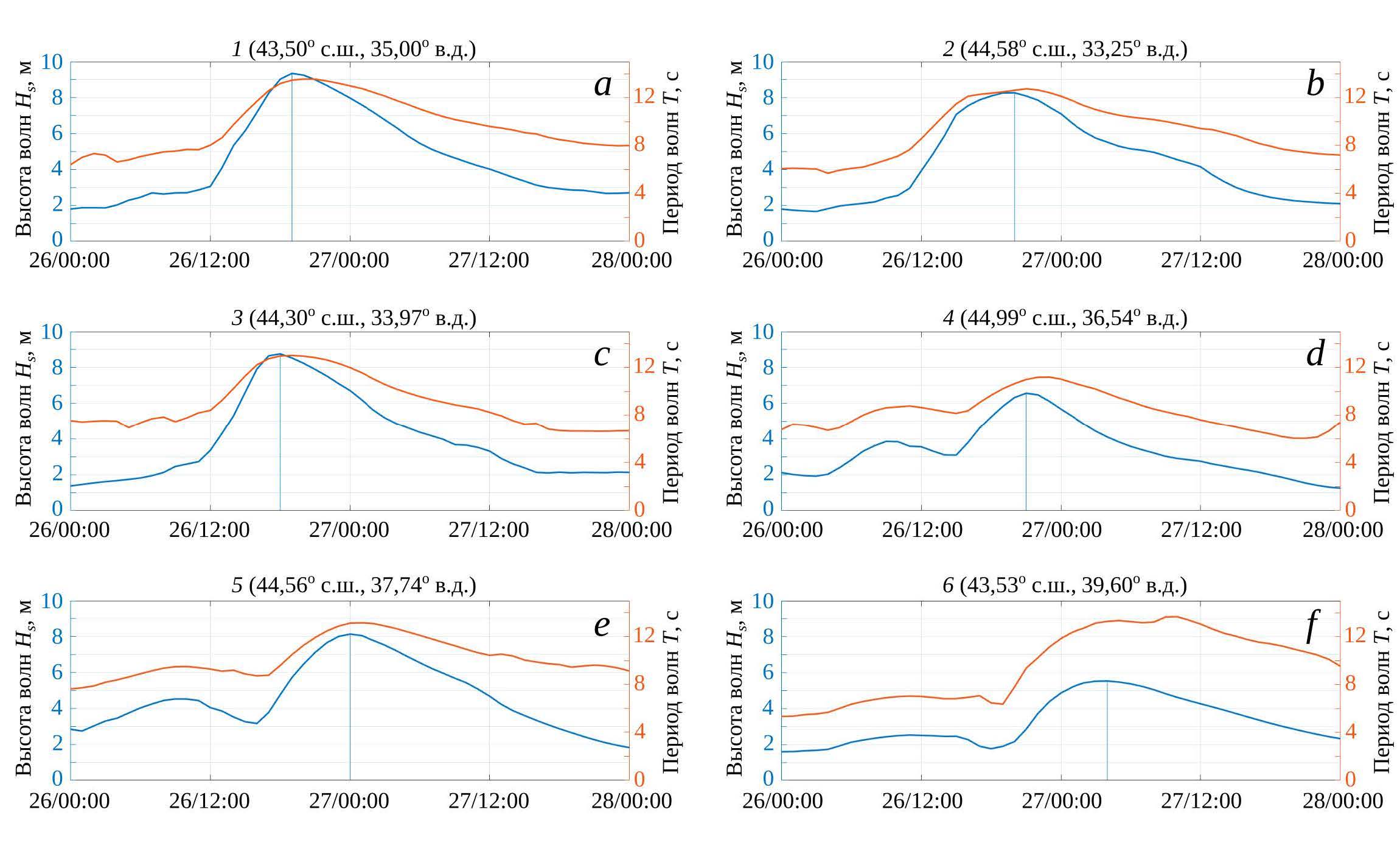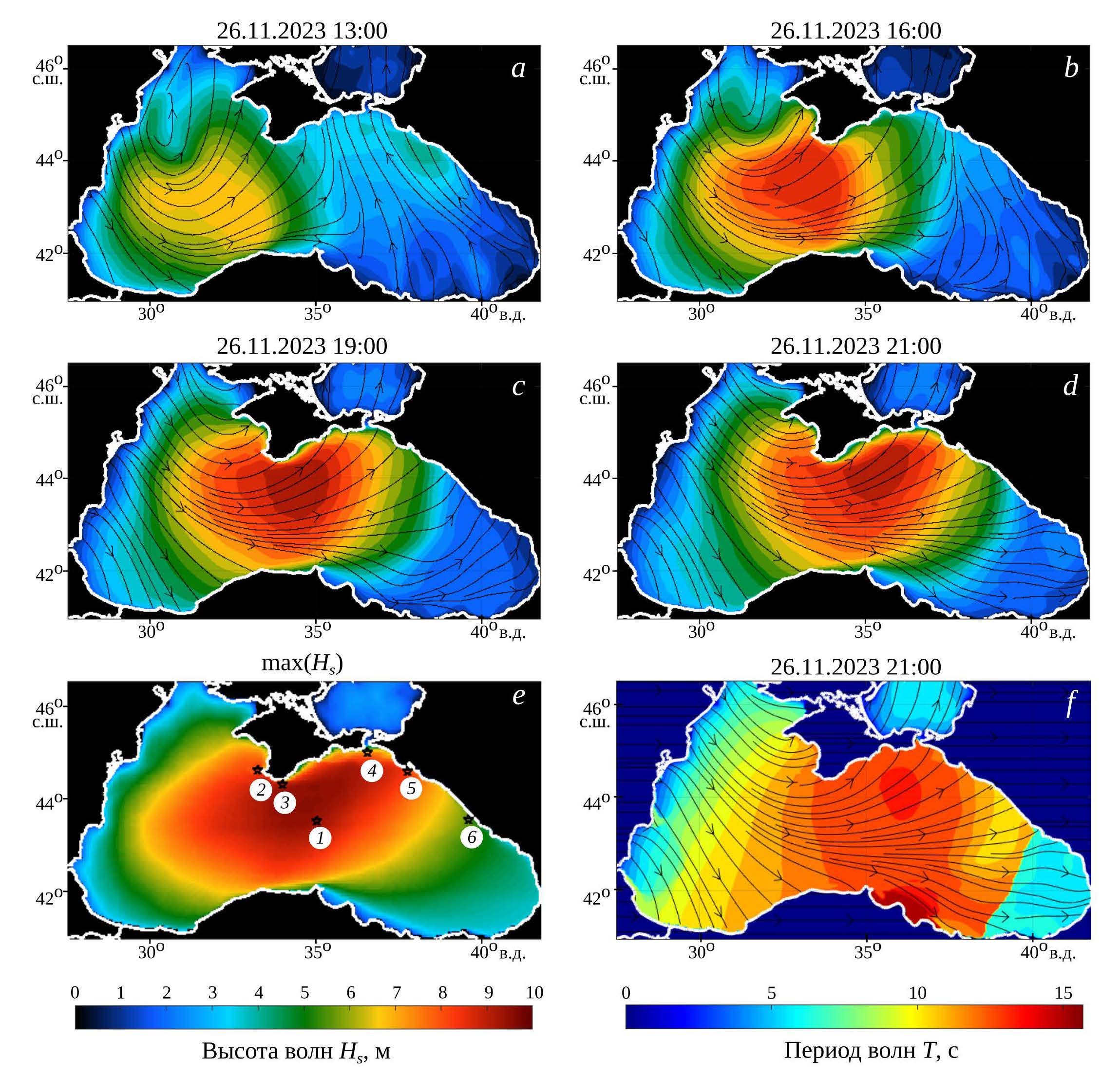 Далее граница области шторма продвигается на восток с ростом высоты и периода штормовых волн. К 13:00 высоты волн достигают 4–5 м (рис. 4, а), начинается отчетливый рост волн в центральной части моря (точка 1) и вблизи Кацивели (точка 3), а также продолжается усиление волнения вблизи Севастополя (точка 2). К 16:00 область наиболее интенсивного штормового волнения захватывает всю центральную часть моря, высоты волн в ней достигают 7 м (рис. 4, b). В 19:00 область шторма продолжает распространяться на восток, высоты волн в ней уже превышают 9 м (рис. 4, c). Примерно в это время достигаются максимумы высоты волн в центре моря (точка 1) и вблизи Кацивели (точка 3). Моменты достижения максимальных высот волн выделены на рис. 5 вертикальными линиями. К 21:00 интенсивные штормовые волны достигают Кавказского побережья Черного моря (точка 5). На рис. 4, d, f показаны поля высот и периодов волн вместе с направлениями волн в 21:00. На всей акватории Черного моря за исключением его западной и восточной оконечностей устанавливается поле развивающихся ветровых волн с направлениями распространения, близкими к направлению ветра, показанному на рис. 3, e. Периоды волн в центральной части моря достигают 12 с и более (рис. 4, f; точка 1 на рис. 5). В восточной части моря четко выделяется фронт штормового волнения (рис. 4, f), распространяющийся на восток. Около 00:00 27 ноября вблизи Новороссийска волны достигают максимальных высот и максимальных периодов (точка 5 на рис. 5), вблизи Сочи начинается рост штормовых волн (точка 6 на рис. 5). Примерно к 04:00 27 ноября волны достигают максимальных характеристик вблизи Сочи (точка 6 на рис. 5). Далее с постепенным снижением скорости ветра происходит снижение высоты волн.