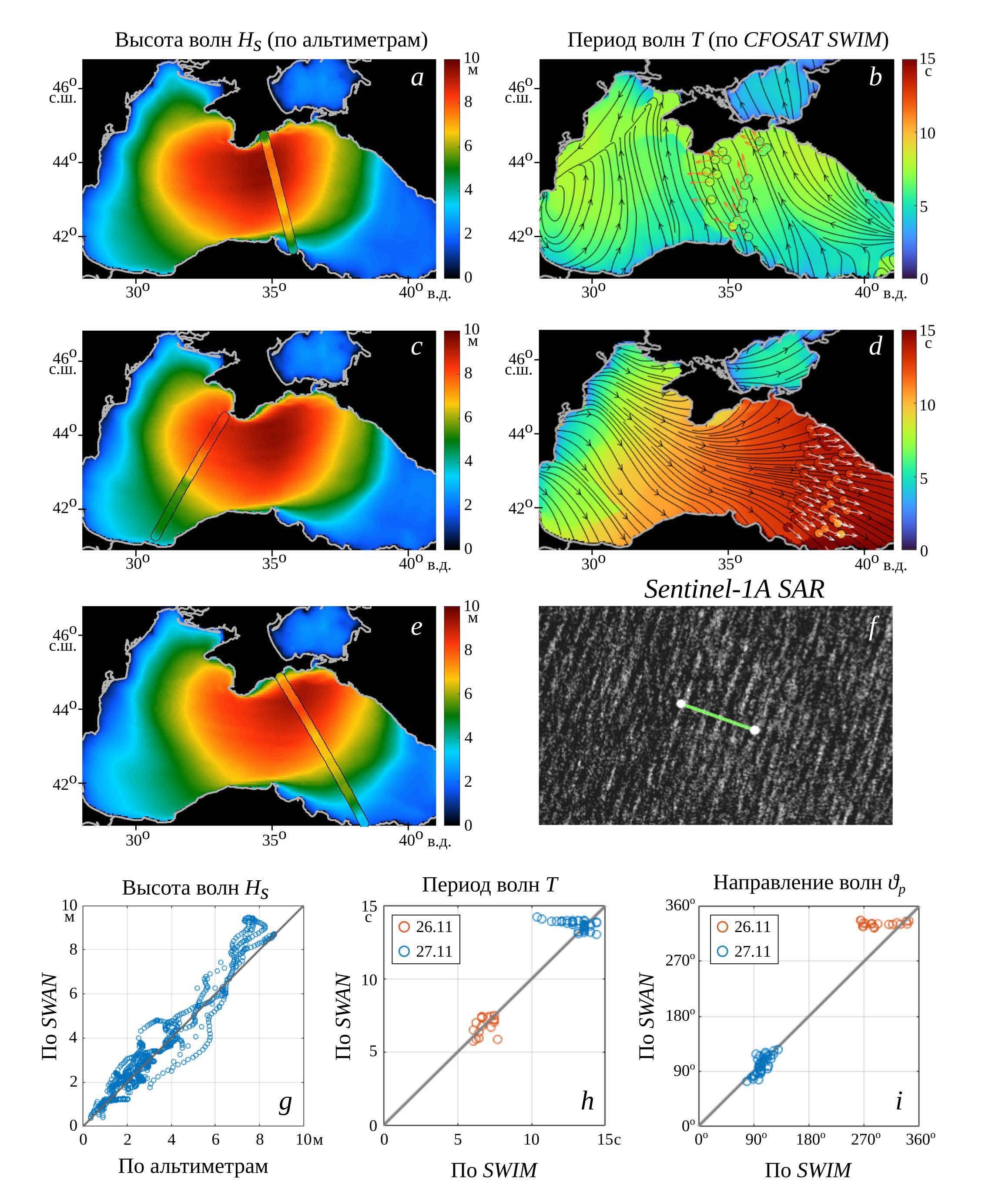 F i g. 6. Comparison of model calculations and satellite data: simulated wave height fields with the superimposed altimeter data from November, 26 at 19:06 (a), 20:23 (c), 21:46 (e); simulated fields of wave periods and directions with the superimposed SWIM data from November, 26 at 04:49 (b) and November, 27 at 04:35 (d); fragment of SAR image with the superimposed line of 1 km long (f). Comparison of simulations and satellite data in terms of wave heights (g), periods (h) and directions (i)