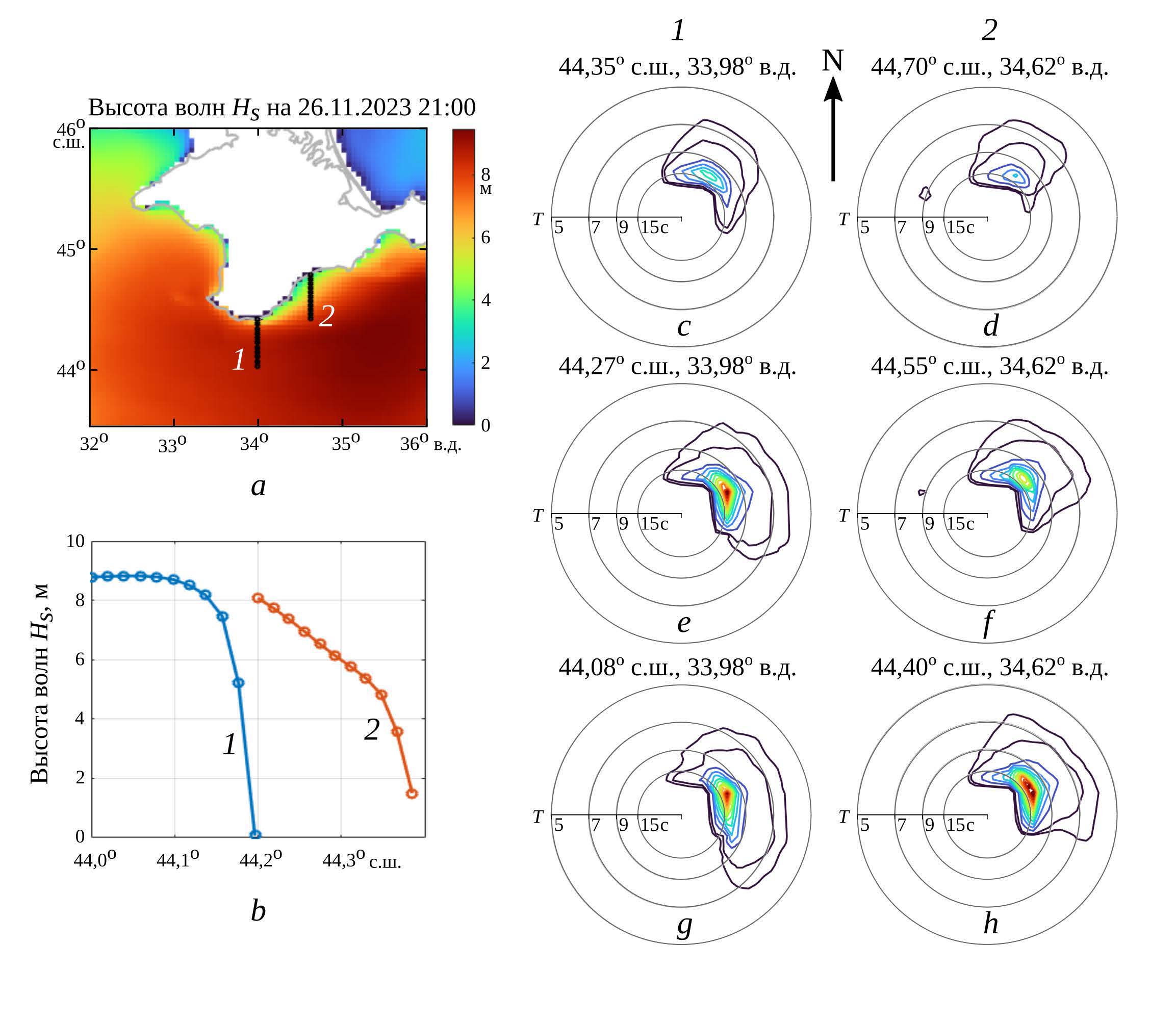 К областям разрезов подходят волны, развивавшиеся от западной оконечности моря, которые имеют относительно широкий угловой спектр. Крымский п-ов затеняет часть направлений распространения волн, что приводит к удалению из спектра соответствующих волновых гармоник. В южной части разрезов (рис. 7, e, g) спектры включают волны, распространяющиеся как на северо-восток, так и на юго-восток. В северной части разрезов (рис. 7, c, d) волны, распространяющиеся на юго-восток, отсутствуют из-за затенения. На рис. 7, e, f показан переход между этими состояниями. В результате «вырезания» волн юго-восточного направления из спектра суммарная волновая энергия существенно спадает и высота волн понижается с 9 м до ~ 4 м (рис. 7, а, b).