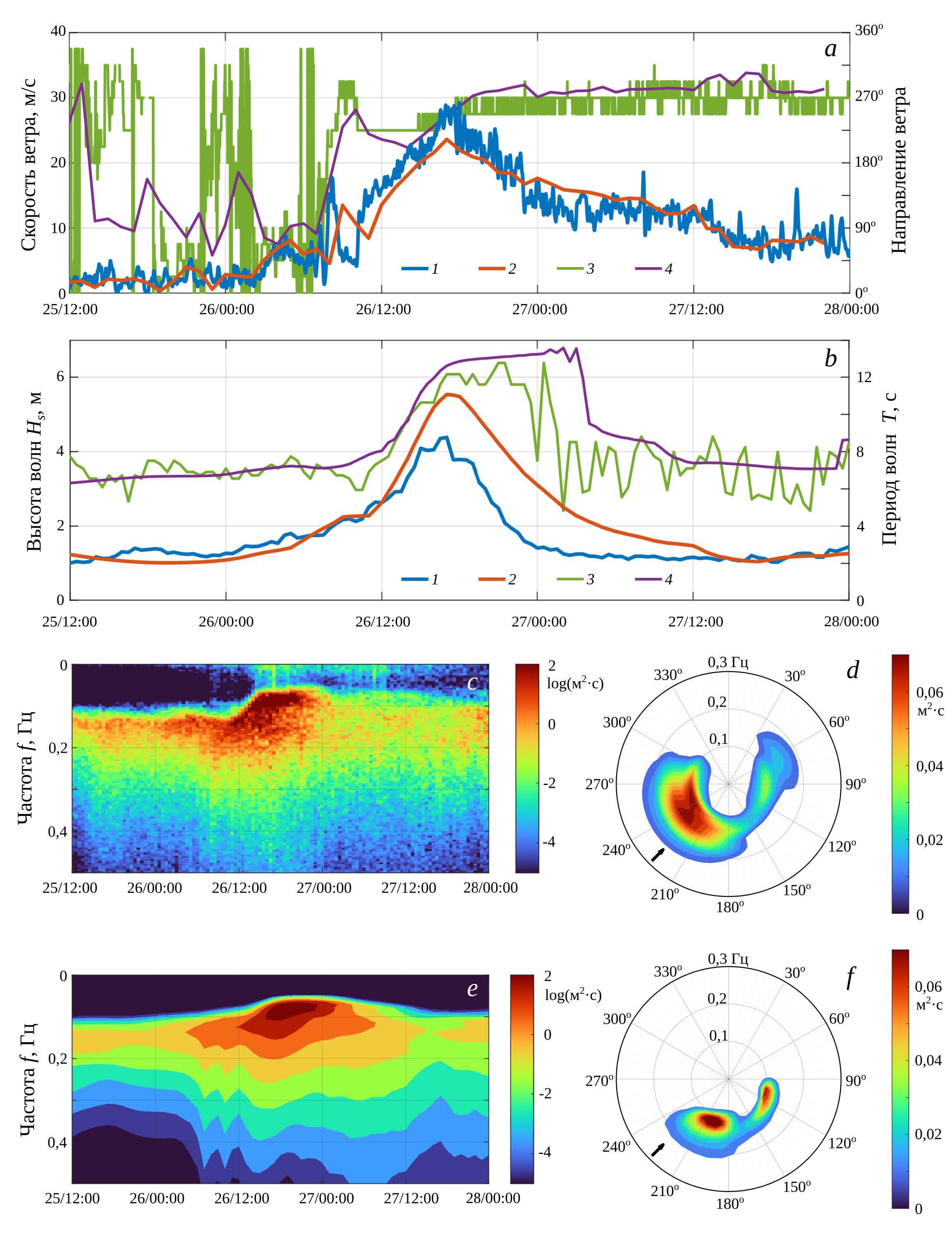 Р и с. 8. Контактные измерения и моделирование: скорость и направление ветра измеренные (1 и 3) и рассчитанные (2 и 4) – (а); высота и период волн измеренные (1 и 3) и рассчитанные (2 и 4) – (b); частотный спектр волн по измерениям (с) и моделированию (е); частотно-угловые спектры волн 26 ноября в 14:00–14:20 по измерениям (d) и моделированию (f)