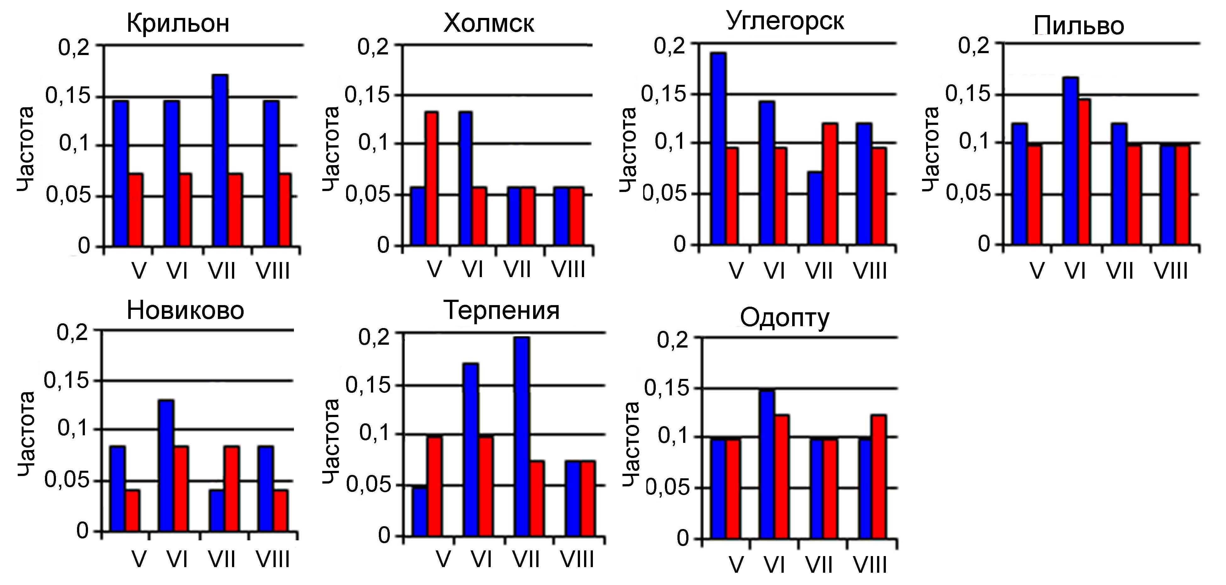 Рис. 3. Частота появления крупных отрицательных (синий цвет) и положительных (красный цвет) аномалий температуры воды на ГМС в мае – августе 1980–2021 гг.
