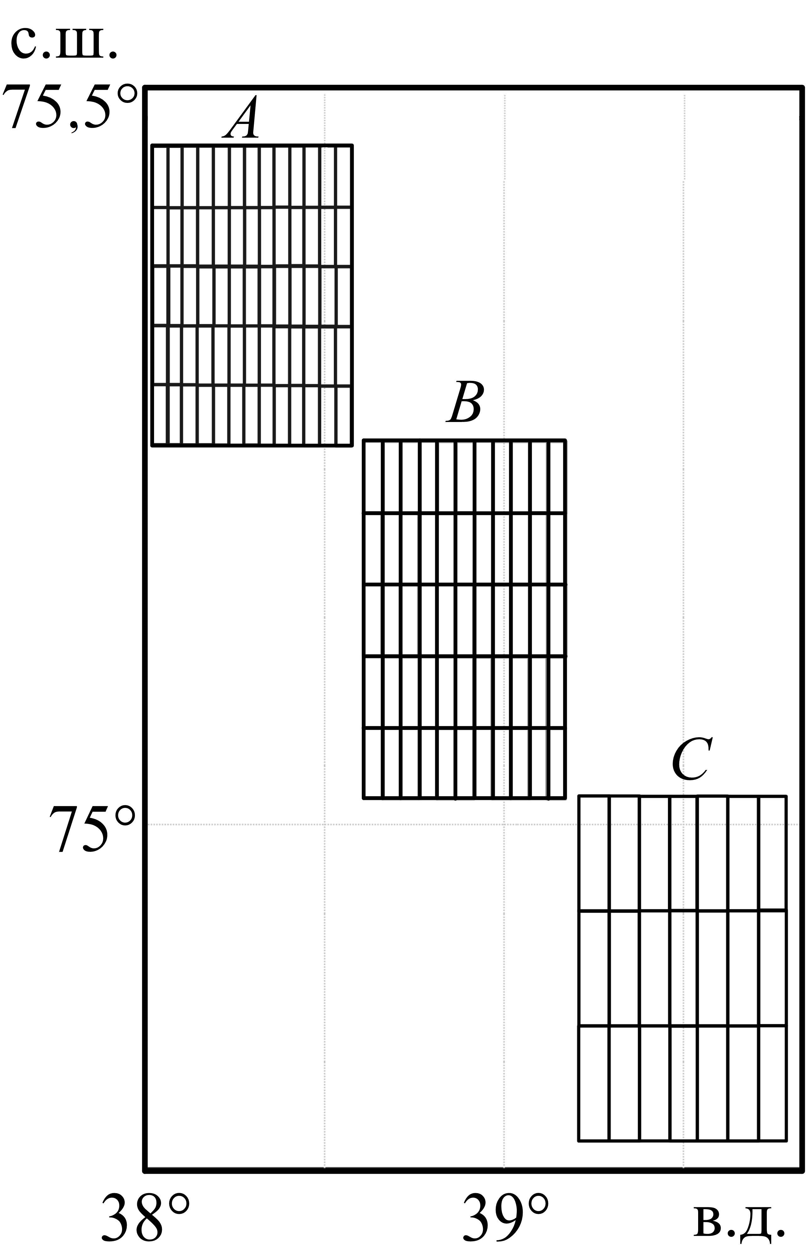 Fig.2. Schematic representation of grids for each data array: A – MODIS/Aqua and VIIRS/Suomi NPP; B – GHRSST OSTIA; C – GLORYS12v1 and PSY4QV3R1