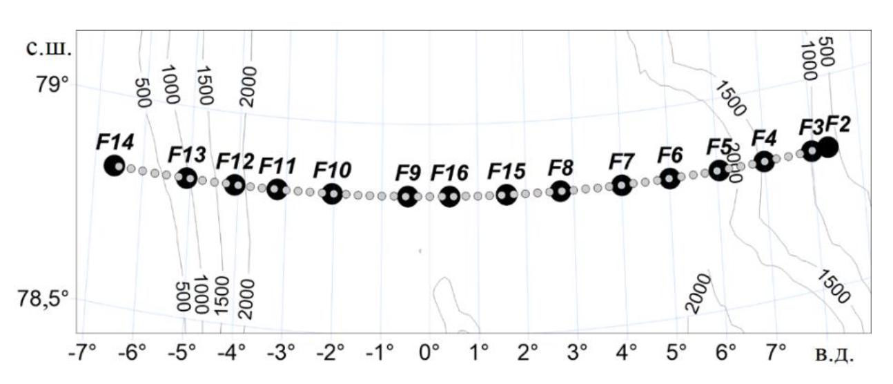 Несмотря на то что начальные данные прошли контроль качества [17], анализ временных серий показал, что необходимо провести дополнительные процедуры. Было выявлено, что шесть временных серий имеют отрицательные значения горизонтов измерений. Такие данные были отбракованы. Дополнительно были отфильтрованы данные, выходящие за границы физической изменчивости. Приведенные ниже критерии были выбраны на основе статистического анализа исходных данных. Данные, выходящие за пределы 3σ, исключались из анализа. Так, для температуры бы выбран диапазон −2,5÷6 °С, для солености 30÷36 ЕПС. Компоненты скорости течения отфильтровывались, если скорость превышала 2 м/с. Из обработанного массива данных были отобраны самые длительные временные серии с АБС, расположенных на широте 78,5° с. ш. (рис. 1). Критерием отбора данных измерений той или иной АБС для последующего анализа была продолжительность временной серии и пространственное положение, позволяющее использовать данные для построения вертикального разреза через пролив Фрама.