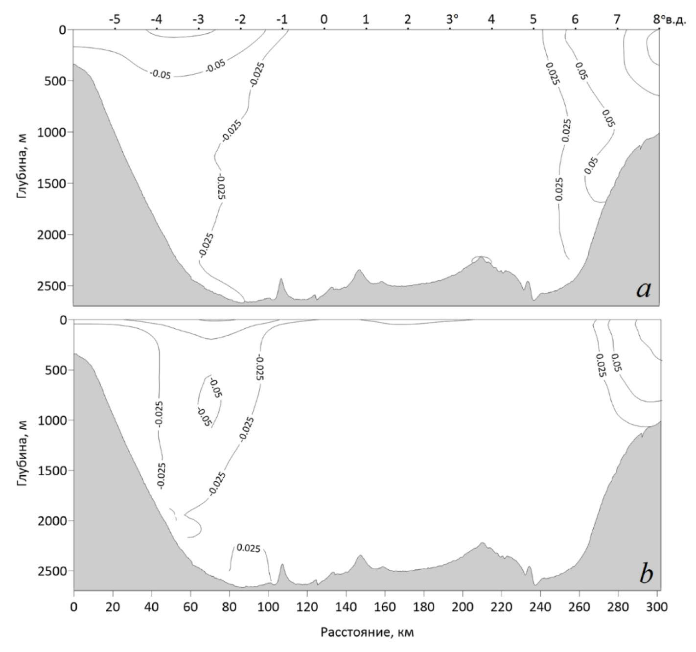 На рис. 3 представлены годовые значения меридиональных скоростей течений по данным АБС (рис. 3, а) и реанализа (рис. 3, b).