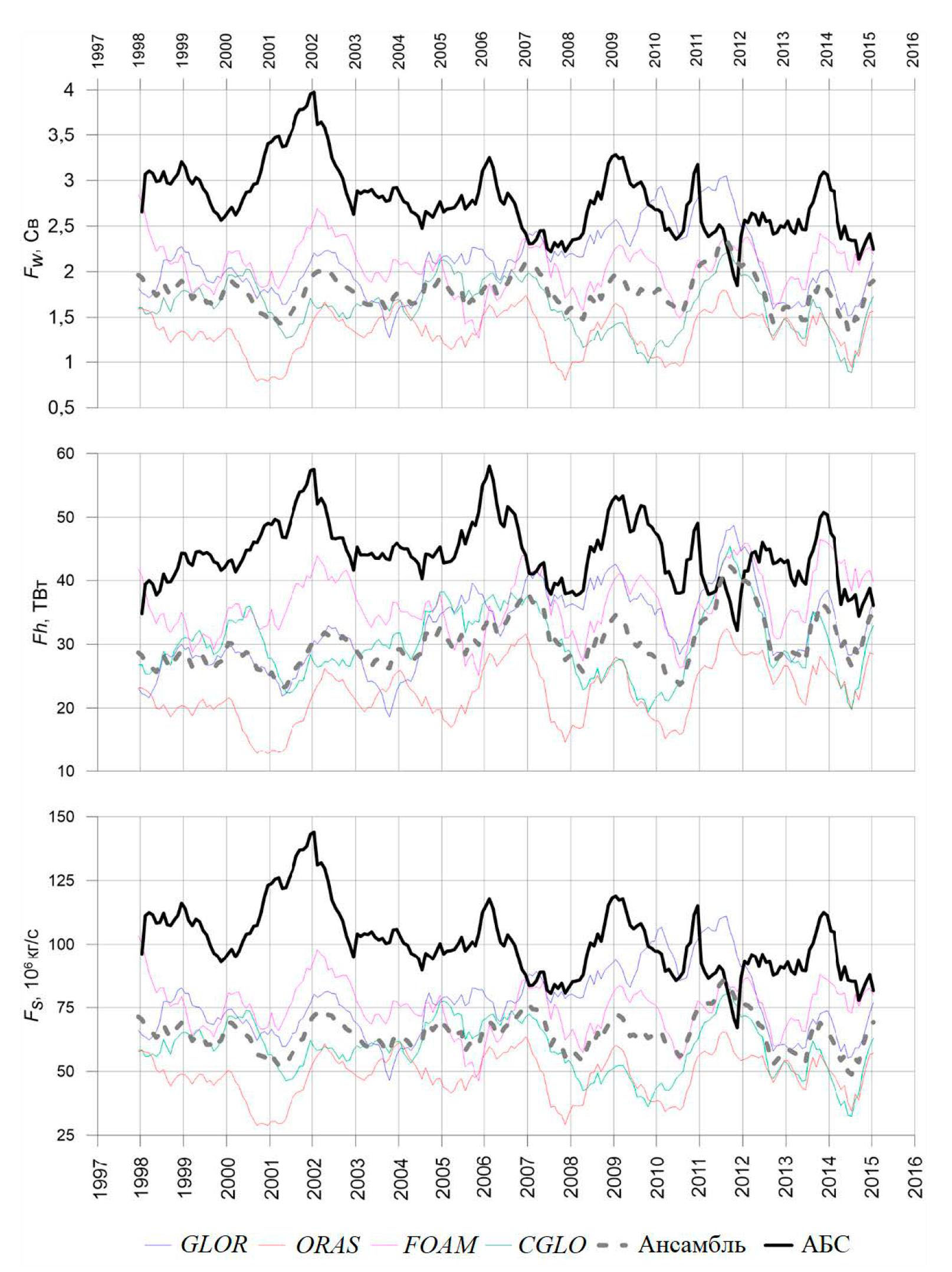 Из рис. 4 видно, что данные реанализов в целом занижают величину тепломассопереноса. Так, среднее значение переноса объема, по данным АБС, выше ансамблевого среднего более чем на 30 %, а его среднеквадратическое отклонение (СКО) – на 50 %. Аналогичная картина наблюдается в переносах тепла и соли (табл. 2).