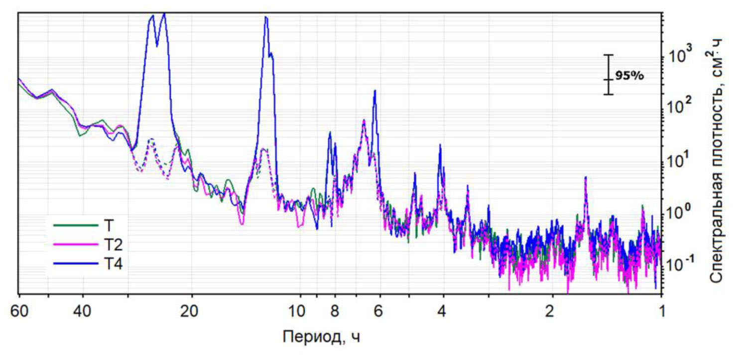 Периоды максимумов в спектральных плотностях колебаний уровня приведены в табл. 1. Также в этой таблице сопоставлены значения полученных периодов и аналогичные им значения периодов приливных гармоник, согласно работе [2]. Спектральные пики, не имеющие близких к приливным гармоникам периодов, можно отнести к волновым процессам другой, неприливной, природы.