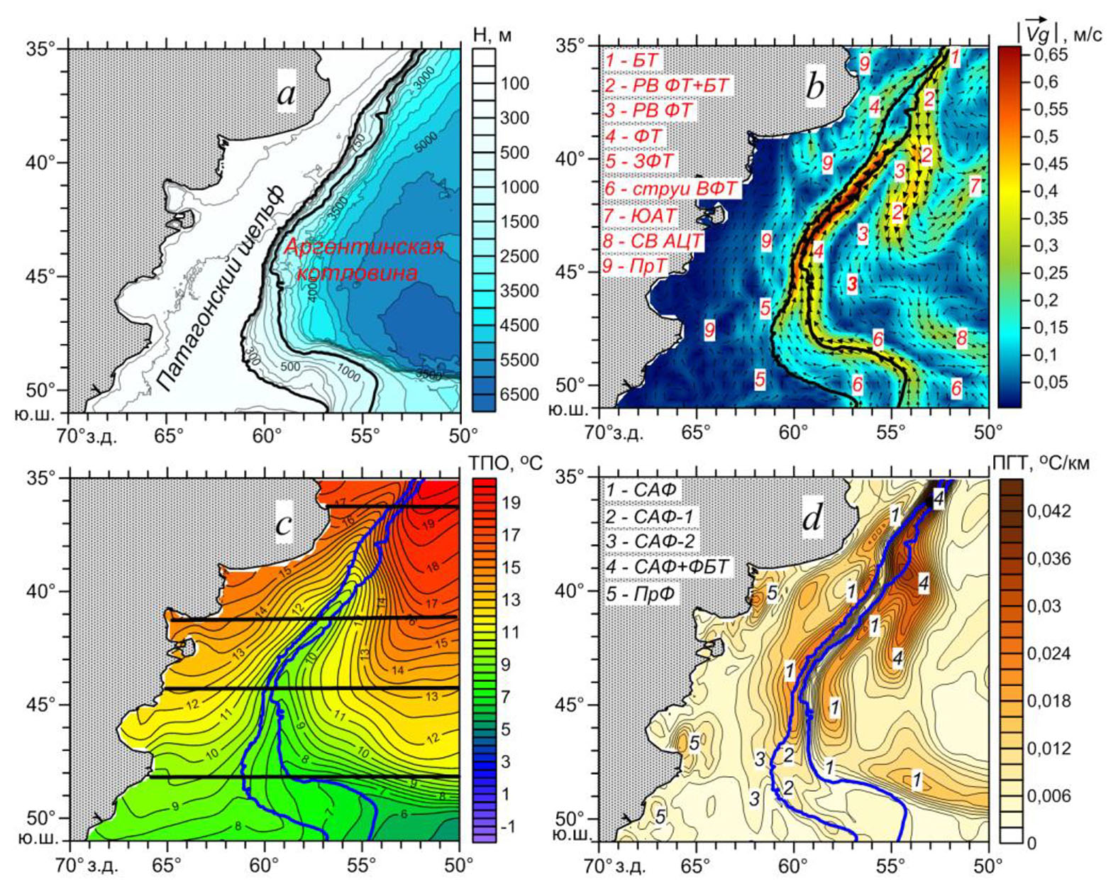 Рис. 1. Схема рельефа дна в районе исследования (а), пространственное распределение среднемноголетних значений модуля скорости и векторов геострофических течений (b), температуры (c), полного градиента температуры (d) на поверхности океана. Жирными линиями выделены изобаты 200 м и 1400 м. Горизонтальными линиями показаны географические параллели, для которых представлены климатические среднегодовые и среднемесячные распределения ЗГТ и Vg. Обозначения: БТ – Бразильское течение, ФТ – Фолклендское течение, РВ ФТ – рециркуляционная ветвь Фолклендского течения, ЗФТ – Западное Фолклендское течение, ВФТ – Восточное Фолклендское течение, ЮАТ – Южно-Атлантическое течение, СВ АЦТ – Северная ветвь Антарктического циркумполярного течения, ПрТ – прибрежные течения, САФ – Субантарктический фронт, ФБТ – Фронт Бразильского течения, ПрФ – прибрежные фронты