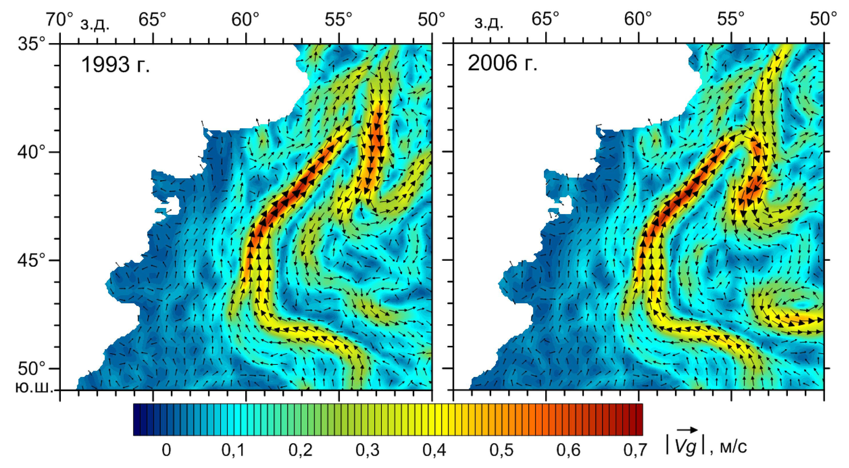 Основные особенности циркуляции, выявленные в среднемноголетнем поле геострофической скорости, хорошо проявляются на распределениях векторов течений и модуля скорости для каждого года (рис. 3). Несмотря на межгодовую изменчивость интенсивности потоков, положение основных струй ЗФТ, ВФТ, ФТ, потока РВ ФТ+БТ и двух рециркуляций ФТ (в районе 40° ю. ш. и между 35° и 36° ю. ш.), контролируемое особенностями рельефа дна, сохраняется в течение каждого года.