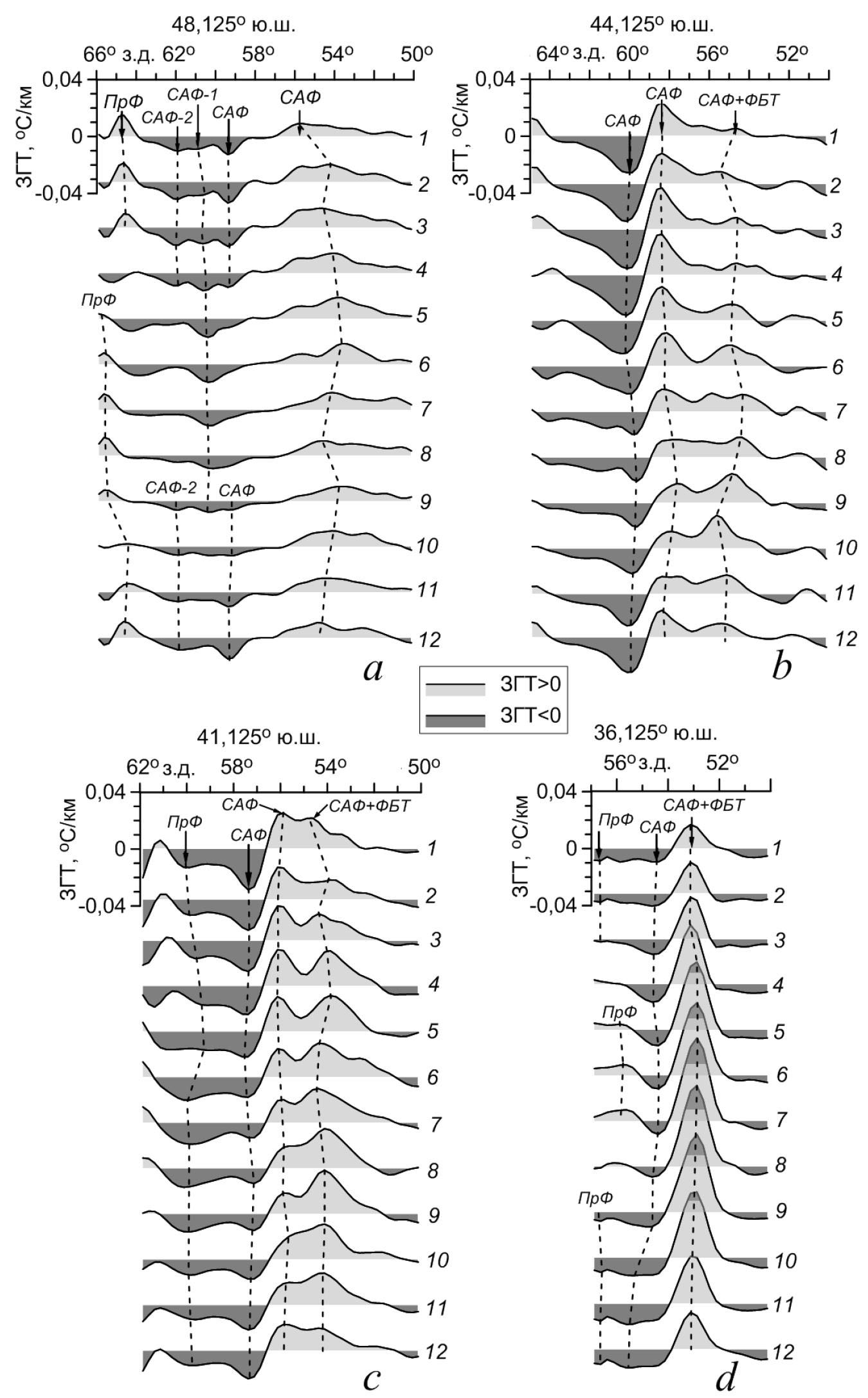 Распределения климатических среднемесячных зональных градиентов ТПО показали, что под влиянием рельефа дна ветви САФ, особенно на западной периферии меандра, имеют устойчивое положение, их внутригодовые смещения по долготе не превышают 1° (рис. 5, 6). Вместе с тем внутригодовые изменения интенсивности ветвей САФ заметно различаются на разных участках акватории: на юге их значения не превышают 0,012°С/км (рис. 6, a), севернее 45° ю. ш. они увеличиваются до 0,016–0,02°С/км (рис. 6, b, c), у вершины меандра снова уменьшаются и на 35–36° ю. ш. составляют 0,006°С/км (рис. 6, d). Значения сезонных изменений интенсивности САФ+ФБТ уменьшаются в южном направлении от 0,04–0,05°С/км на 35–36° ю. ш. до 0,012°С/км на 44° ю. ш. (рис. 6, b – d).