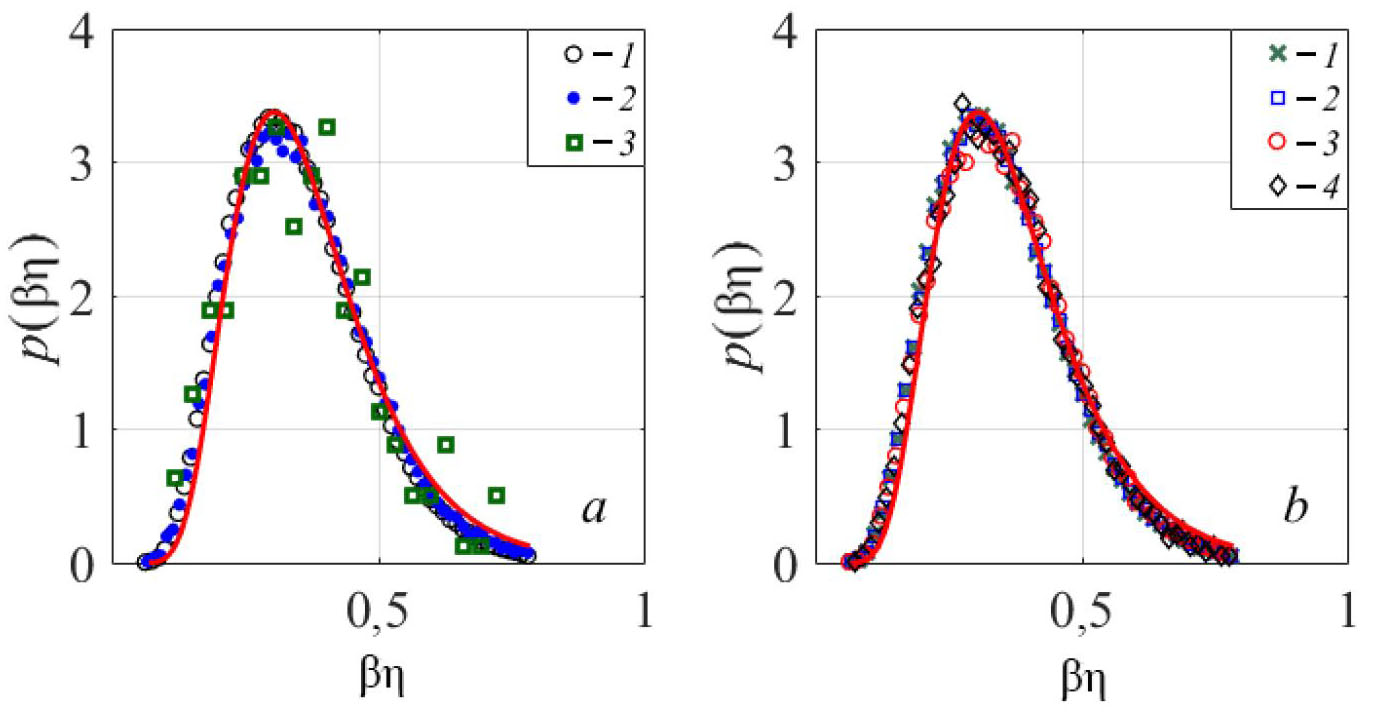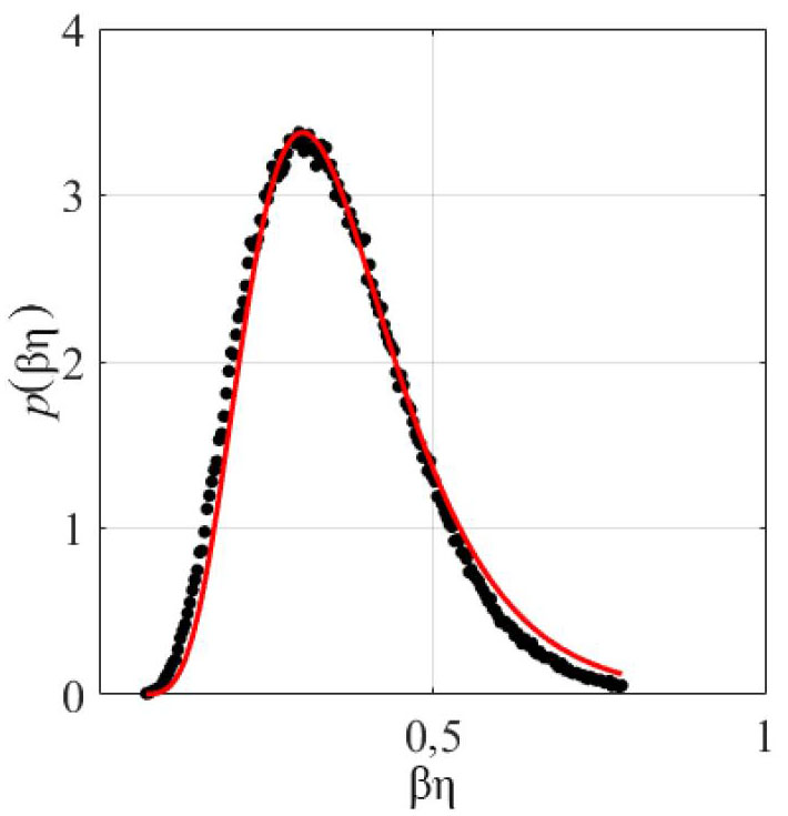 Рассмотрим плотность вероятности p(βη). На рис. 1 черными точками показано ее распределение, полученное для всех измеренных значений . Плотность вероятности удовлетворительно описывается функцией, показанной на рис. 1 красной линией: