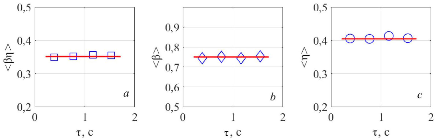 На рис. 3, b ромбиками показаны рассчитанные по формуле (3) оценки β для распределений в рассматриваемых интервалах τ. Значения β имеют небольшой разброс и группируются вокруг среднего ⟨β⟩, равного 0,75 (сплошная линия). Поведение ⟨η⟩ в различных интервалах βη требует отдельного рассмотрения.
