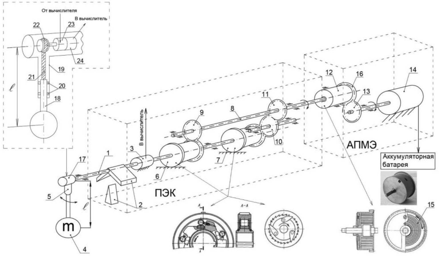 Механизм преобразования энергии (рис. 5) состоит из двух частей: преобразователя энергии качки и аккумулятора преобразователя механической энергии. Вычислитель (см. рис. 4) имеет в своем составе микропроцессорный блок, вырабатывающий команды управления, память с записанным алгоритмом управления, аналого-цифровой и цифро-аналоговый преобразователи, а также усилители аналоговых сигналов для управления насосом и клапанами балластных цистерн, а также приводом телескопической штанги 17 (рис. 5). Вычислитель получает и обрабатывает измерительную информацию, получаемую от датчика 3 угла разворота входного вала 1 (рис. 5), уровнемера балластных цистерн 3 (см. рис. 4), многооборотного датчика угла 24 (рис. 5).