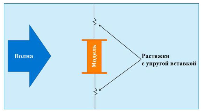 Во время эксперимента модель располагалась поперек бассейна, моделируя положение бортом к набегающим волнам. Модель удерживалась на курсе с помощью системы удержания (рис. 10), представляющей собой два тонких капроновых троса с упругими элементами, прикрепленными с одной стороны к оконечностям модели на высоте ее центра тяжести, а с другой к конструкциям бассейна. Жесткость упругих элементов системы удержания модели определялась требованием достаточной удаленности собственного периода поперечно-горизонтальных колебаний модели, прикрепленной к системе удержания, как от собственного периода бортовых колебаний, так и от среднего периода набегающего волнения. Такой подход позволил минимизировать влияние системы удержания на качку модели.