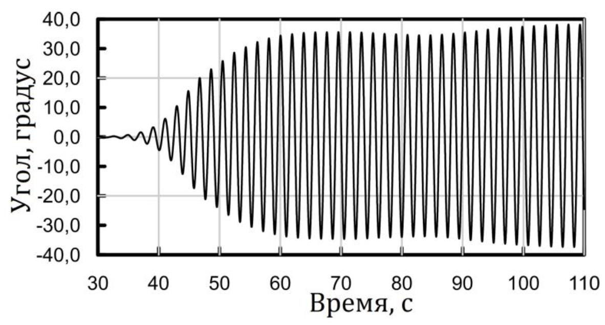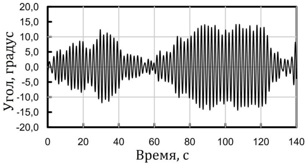Рис. 12. Фрагмент записанной реализации бортовых колебаний (крена) модели в реальном времени на регулярной волне высотой 0,06 м с периодом 1,89 с